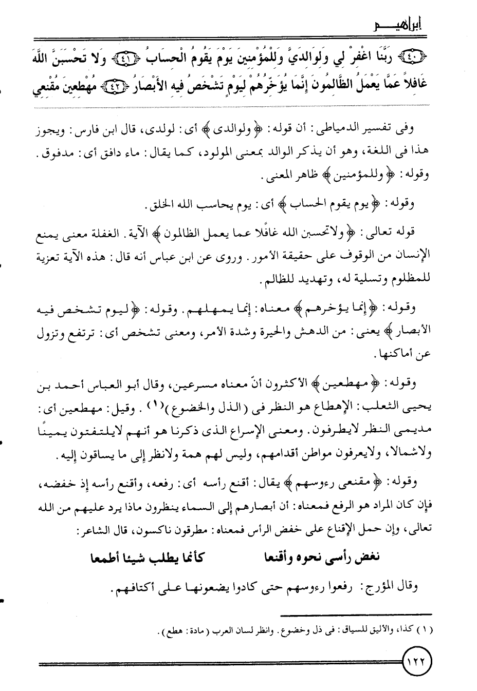 ( {40) رَبنَا اغْفِر لي ولوالدي وَلِلْمُؤْمنِينَ يَوْم يقوم الْحساب (41) وَلَا تحسبن الله غافلا عَمَّا يعْمل الظَّالِمُونَ إِنَّمَا يؤخرهم ليَوْم تشخص فِيهِ الْأَبْصَار (42) مهطعين مقنعي}