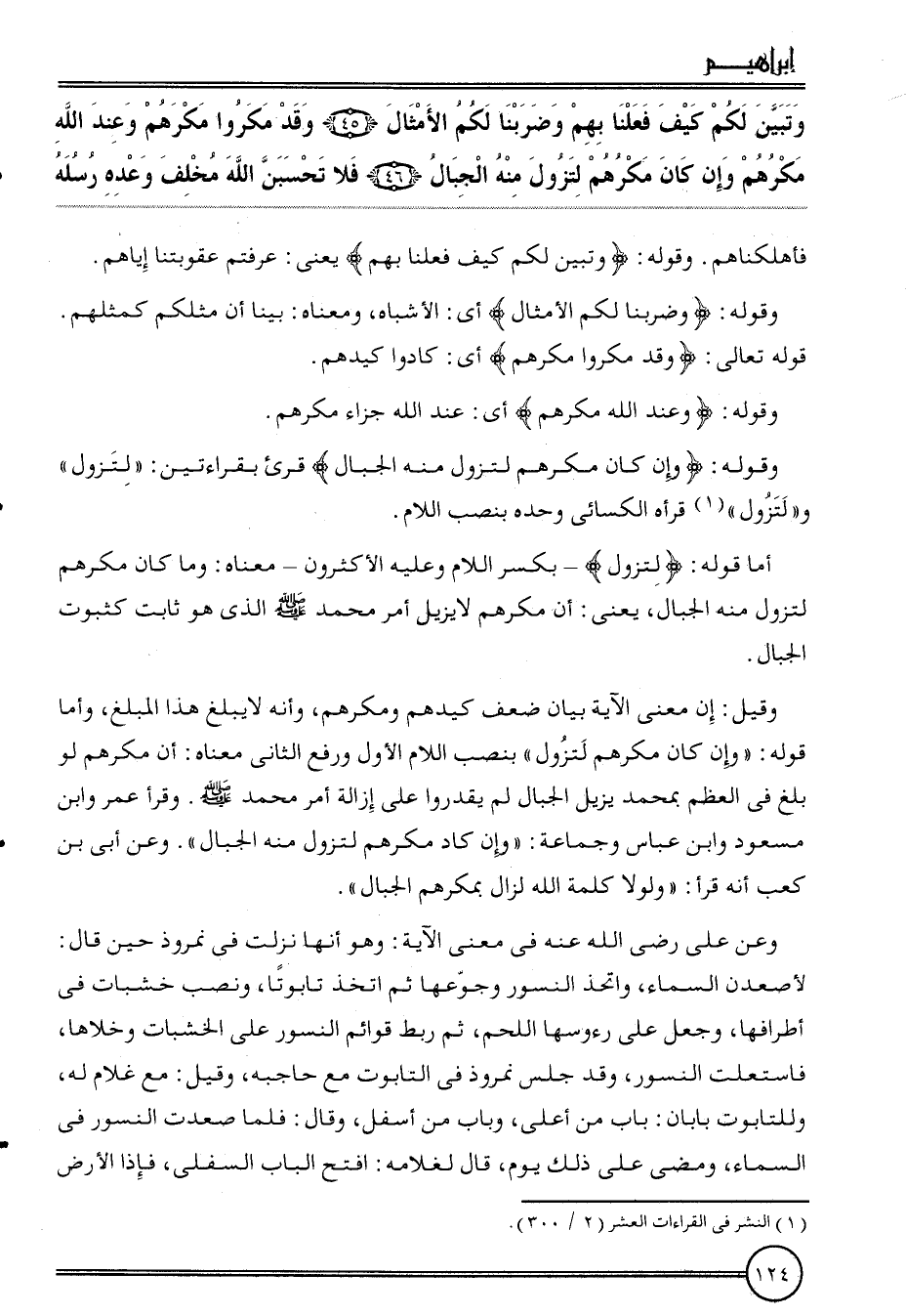 وَقيل: إِن معنى الْآيَة بَيَان ضعف كيدهم ومكرهم، وَأَنه لَا يبلغ هَذَا الْمبلغ، وَأما قَوْله: " وَإِن كَانَ مَكْرهمْ لتزول " بِنصب اللَّام الأول وَرفع الثَّانِي مَعْنَاهُ: أَن مَكْرهمْ لَو بلغ فِي الْعظم بِمُحَمد يزِيل الْجبَال لم يقدروا على إِزَالَة أَمر مُحَمَّد. وَقَرَأَ عمر وَابْن مَسْعُود وَابْن عَبَّاس وَجَمَاعَة: " وَإِن كَاد مَكْرهمْ لتزول مِنْهُ الْجبَال:. وَعَن أبي بن كَعْب أَنه قَرَأَ: " وَلَوْلَا كلمة الله لزال بمكرهم الْجبَال ".