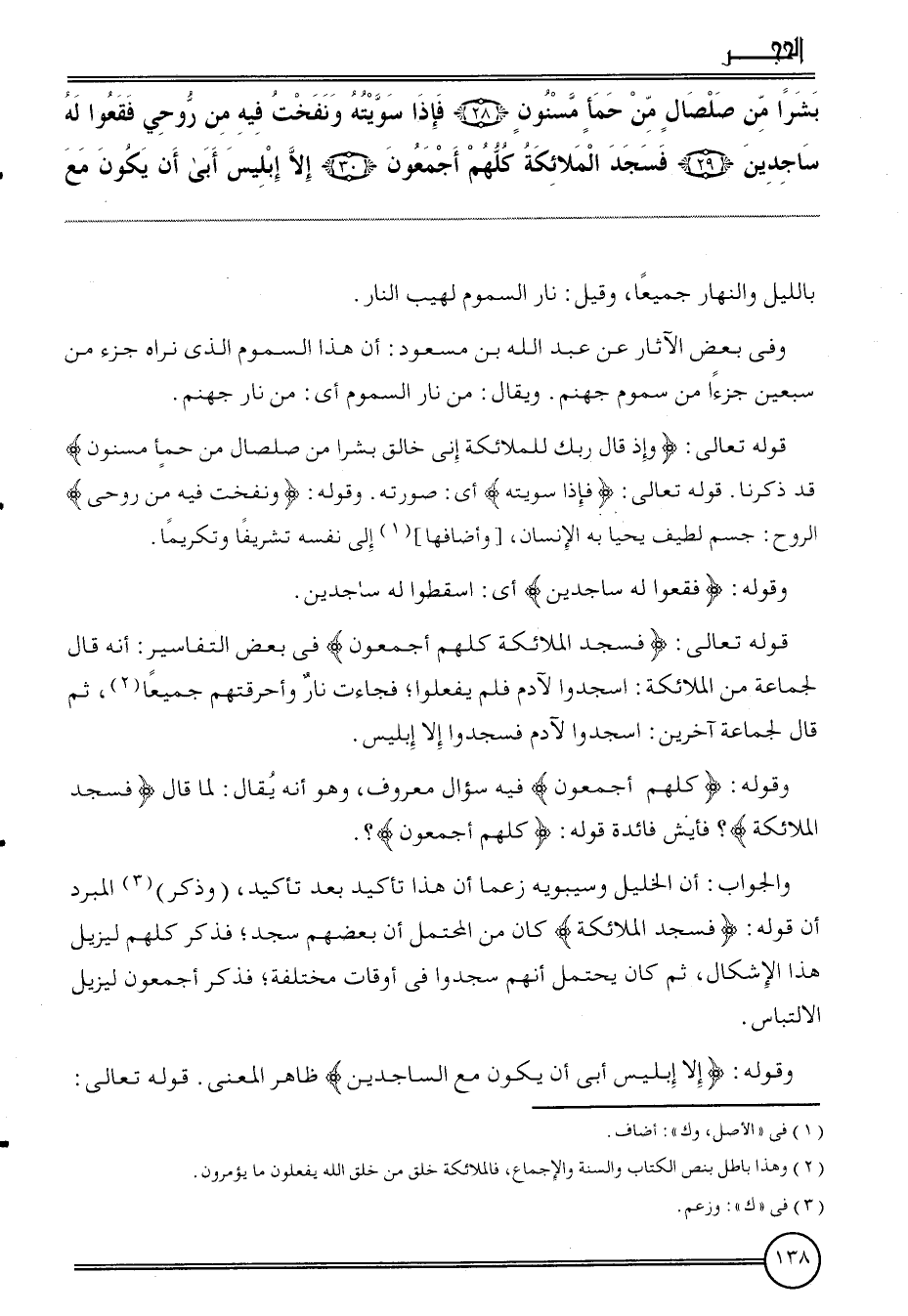 {بشرا من صلصال من حمأ مسنون (28) فَإِذا سويته ونفخت فِيهِ من روحي فقعوا لَهُ ساجدين (29) فَسجدَ الْمَلَائِكَة كلهم أَجْمَعُونَ (30) إِلَّا إِبْلِيس أَبى أَن يكون مَعَ} بِاللَّيْلِ وَالنَّهَار جَمِيعًا، وَقيل: نَار السمُوم لهيب النَّار.