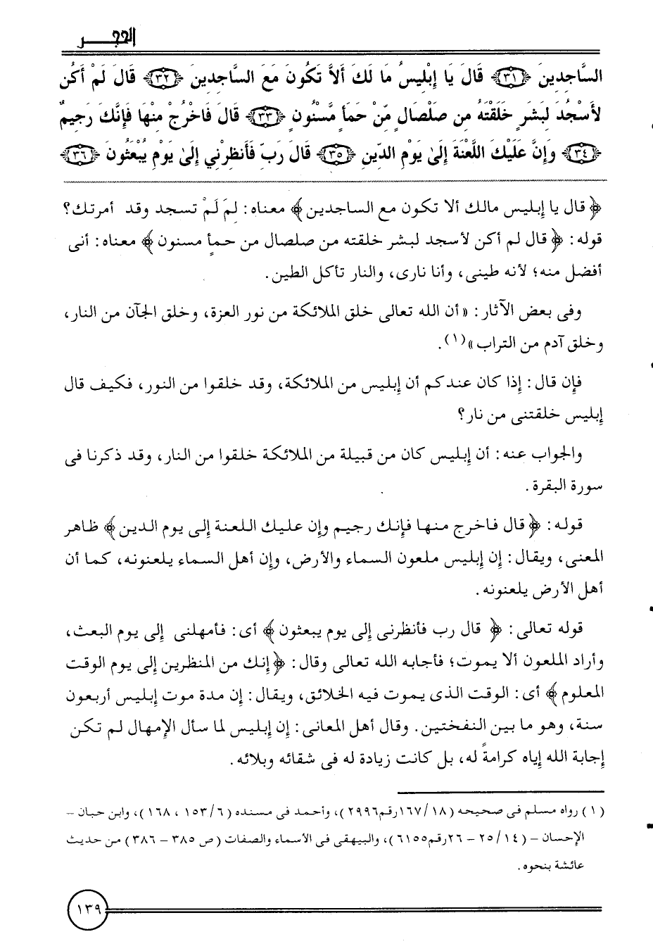 {الساجدين (31) قَالَ يَا إِبْلِيس مَا لَك أَلا تكون مَعَ الساجدين (32) قَالَ لم أكن لأسجد لبشر خلقته من صلصال من حمأ مسنون (33) قَالَ فَاخْرُج مِنْهَا فَإنَّك رجيم (34) وَإِن عَلَيْك اللَّعْنَة إِلَى يَوْم الدّين (35) قَالَ رب فأنظرني إِلَى يَوْم يبعثون (36) } {قَالَ يَا إِبْلِيس مَا لَك أَلا تكون مَعَ الساجدين} مَعْنَاهُ: لم لم تسْجد وَقد أَمرتك؟