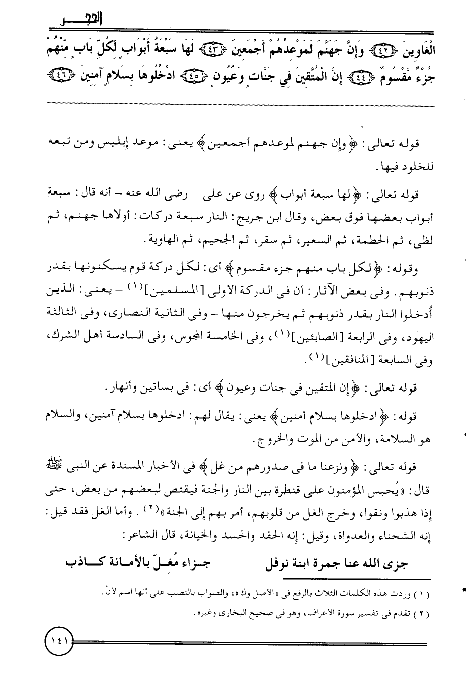 {الغاوين (42) وَإِن جَهَنَّم لموعدهم أَجْمَعِينَ (43) لَهَا سَبْعَة أَبْوَاب لكل بَاب مِنْهُم جُزْء مقسوم (44) إِن الْمُتَّقِينَ فِي جنَّات وعيون (45) ادخلوها بِسَلام آمِنين (46) }