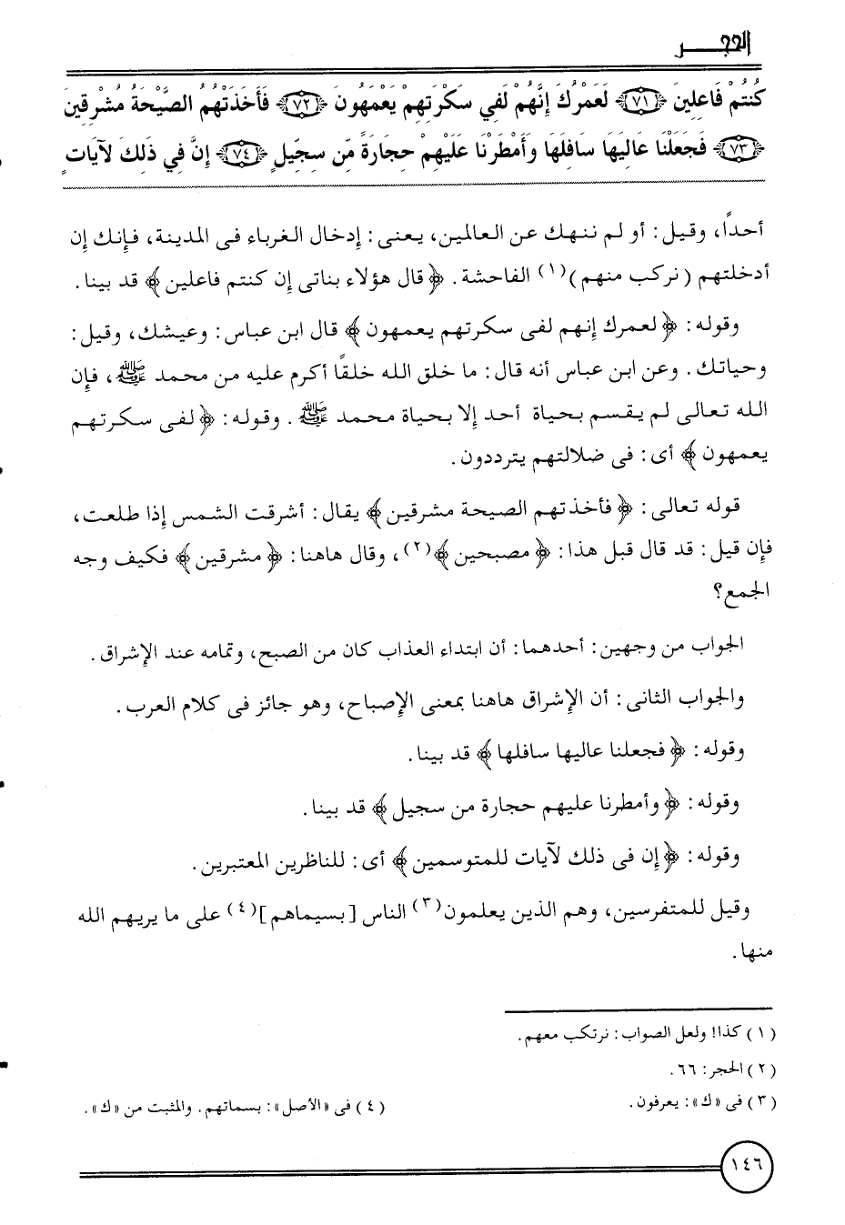 {كُنْتُم فاعلين (71) لعمرك إِنَّهُم لفي سكرتهم يعمهون (72) فَأَخَذتهم الصَّيْحَة مشرقين (73) فَجعلنَا عاليها سافلها وأمطرنا عَلَيْهِم حِجَارَة من سجيل (74) إِن فِي ذَلِك لآيَات} أحدا، وَقيل: أولم ننهك عَن الْعَالمين، يَعْنِي: إِدْخَال الغرباء فِي الْمَدِينَة، فَإنَّك إِن أدخلتهم (نركب مِنْهُم) الْفَاحِشَة.