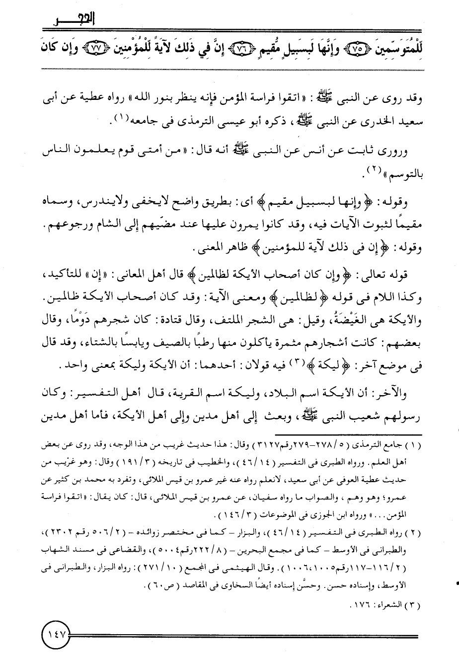 {للمتوسمين (75) وَإِنَّهَا لبسبيل مُقيم (76) إِن فِي ذَلِك لآيَة للْمُؤْمِنين (77) وَإِن كَانَ} وَقد رُوِيَ عَن النَّبِي: " اتَّقوا فراسة الْمُؤمن فَإِنَّهُ ينظر بِنور الله " رَوَاهُ عَطِيَّة عَن أبي سعيد الْخُدْرِيّ عَن النَّبِي، ذكره أَبُو عِيسَى التِّرْمِذِيّ فِي جَامعه.