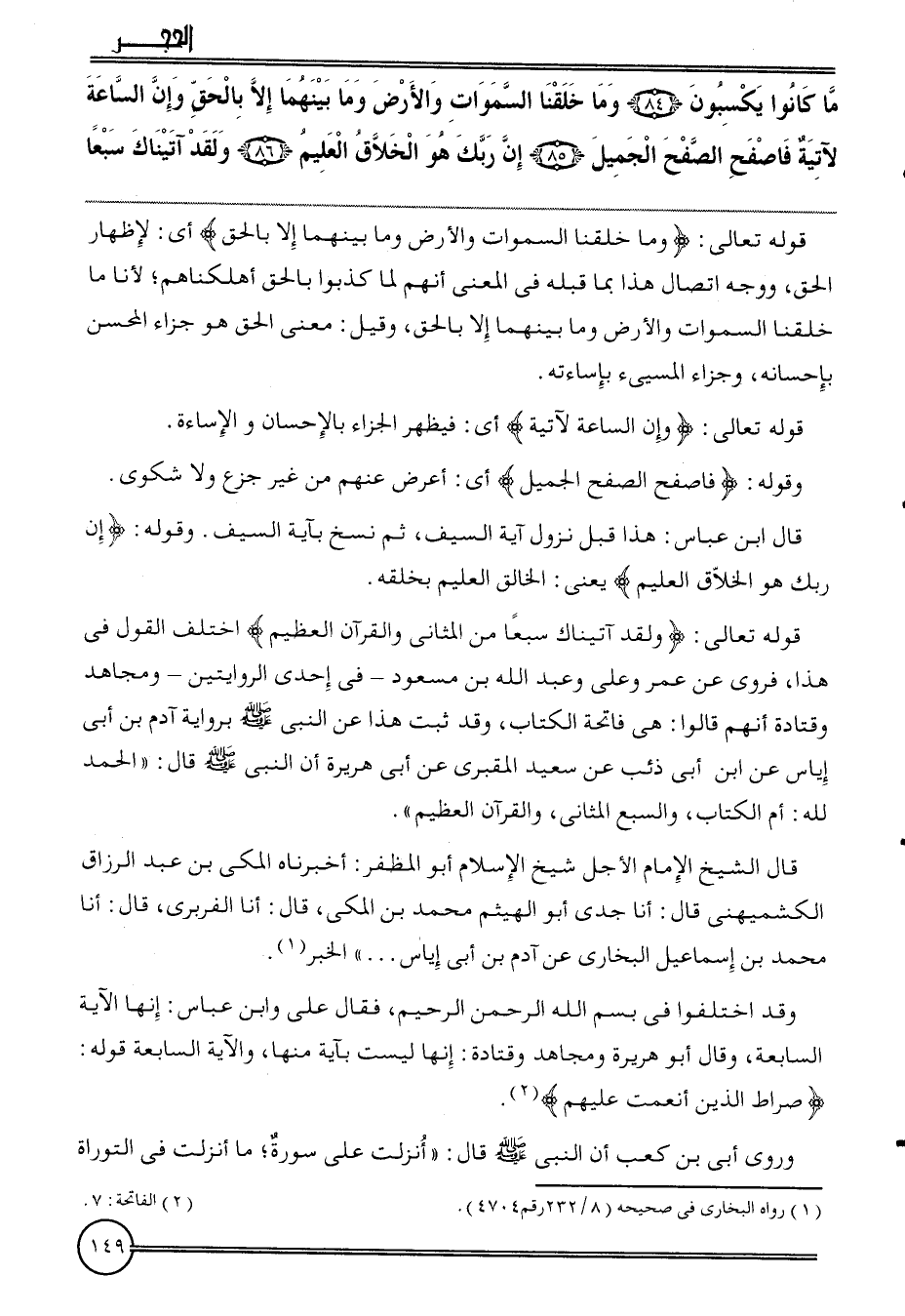 قَوْله تَعَالَى: {وَلَقَد آتيناك سبعا من المثاني وَالْقُرْآن الْعَظِيم} اخْتلف القَوْل فِي هَذَا، فَروِيَ عَن عمر وَعلي وَعبد الله بن مَسْعُود - فِي إِحْدَى الرِّوَايَتَيْنِ - وَمُجاهد وَقَتَادَة أَنهم قَالُوا: هِيَ فَاتِحَة الْكتاب، وَقد ثَبت هَذَا عَن النَّبِي بِرِوَايَة آدم بن أبي إِيَاس عَن ابْن أبي ذِئْب عَن سعيد المَقْبُري عَن أبي هُرَيْرَة أَن النَّبِي قَالَ: " الْحَمد لله: أم الْكتاب، والسبع المثاني، وَالْقُرْآن الْعَظِيم ".