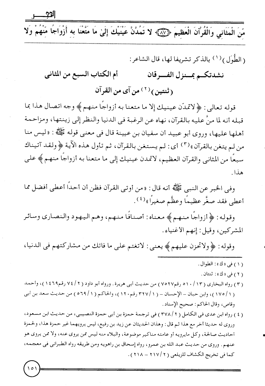 {من المثاني وَالْقُرْآن الْعَظِيم (87) لَا تَمُدَّن عَيْنَيْك إِلَى مَا متعنَا بِهِ أَزْوَاجًا مِنْهُم وَلَا} (الطول) بِالذكر تَشْرِيفًا لَهَا، قَالَ الشَّاعِر: