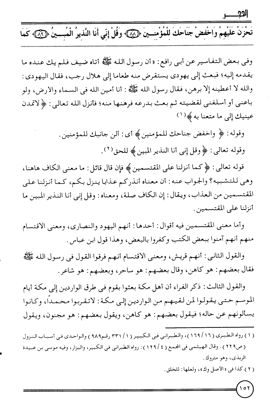 {تحزن عَلَيْهِم واخفض جناحك للْمُؤْمِنين (88) وَقل إِنِّي أَنا النذير الْمُبين (89) كَمَا} وَفِي بعض التفاسير عَن أبي رَافع: " أَن رَسُول الله أَتَاهُ ضيف فَلم يَك عِنْده مَا يقدمهُ إِلَيْهِ؛ فَبعث إِلَى يَهُودِيّ يستقرض مِنْهُ طَعَاما إِلَى هِلَال رَجَب، فَقَالَ الْيَهُودِيّ: وَالله لَا أعطينه إِلَّا برهن، فَقَالَ رَسُول الله: أَنا أَمِين الله فِي السَّمَاء وَالْأَرْض، وَلَو بَاعَنِي أَو أَسْلفنِي لقضيته ثمَّ بِعْت بدرعه فرهنها مِنْهُ؛ فَأنْزل الله تَعَالَى: {لَا تَمُدَّن عَيْنَيْك إِلَى مَا متعنَا بِهِ} .