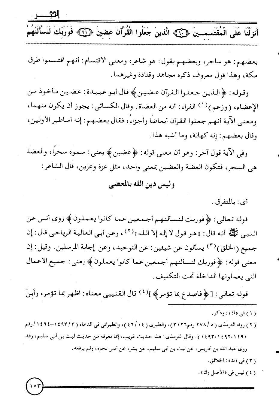 وَقَوله: {الَّذين جعلُوا الْقُرْآن عضين} قَالَ أَبُو عُبَيْدَة: عضين مَأْخُوذ من الإعضاء، (وَزعم) الْفراء: أَنه من الْعضَاة. وَقَالَ الْكسَائي: يجوز أَن يكون مِنْهُمَا، وَمعنى الْآيَة أَنهم جعلُوا الْقُرْآن أبعاضا وأجزاء، فَقَالَ بَعضهم: إِنَّه أساطير الْأَوَّلين، وَقَالَ بَعضهم: إِنَّه كهَانَة، وَمَا أشبه هَذَا.