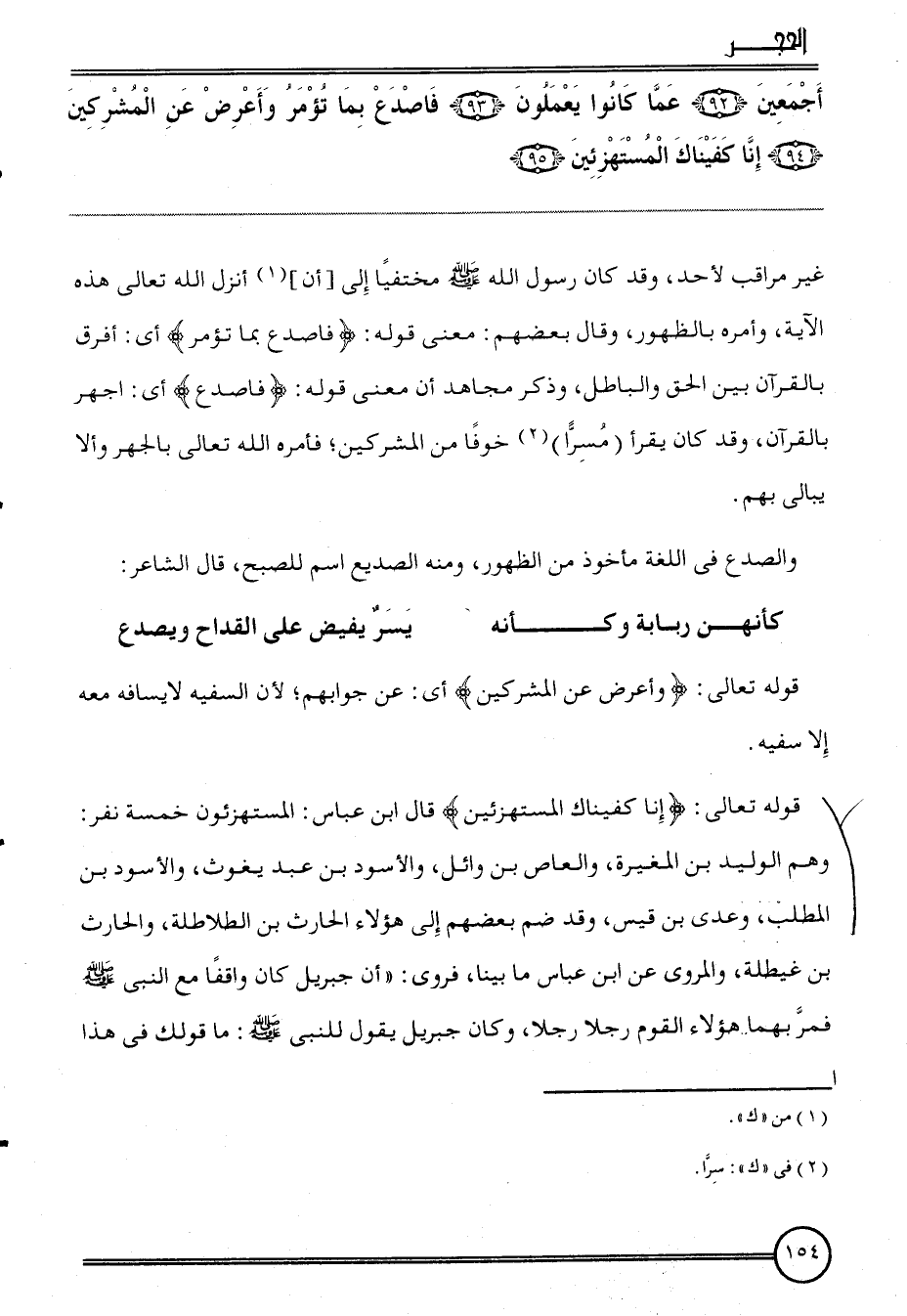 {أَجْمَعِينَ (92) عَمَّا كَانُوا يعْملُونَ (93) فَاصْدَعْ بِمَا تُؤمر وَأعْرض عَن الْمُشْركين (94) إِنَّا كَفَيْنَاك الْمُسْتَهْزِئِينَ (95) } غير مراقب لأحد، وَقد كَانَ رَسُول الله مختفيا إِلَى [أَن] أنزل الله تَعَالَى هَذِه الْآيَة، وَأمره بالظهور، وَقَالَ بَعضهم: معنى قَوْله: {فَاصْدَعْ بِمَا تُؤمر} أَي: أفرق بِالْقُرْآنِ بَين الْحق وَالْبَاطِل، وَذكر مُجَاهِد أَن معنى قَوْله: {فَاصْدَعْ} أَي: اجهر بِالْقُرْآنِ، وَقد كَانَ يقْرَأ (مسرا) خوفًا من الْمُشْركين؛ فَأمره الله تَعَالَى بالجهر وَألا يُبَالِي بهم.