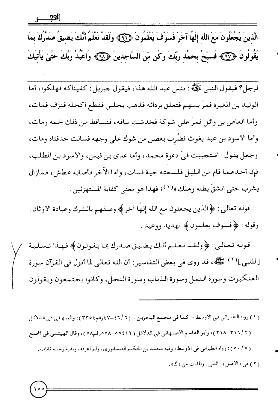 {الَّذين يجْعَلُونَ مَعَ الله إِلَهًا آخر فَسَوف يعلمُونَ (96) وَلَقَد نعلم أَنَّك يضيق صدرك بِمَا يَقُولُونَ (97) فسبح بِحَمْد رَبك وَكن من الساجدين (98) واعبد رَبك حَتَّى يَأْتِيك} الرجل؟ فَيَقُول النَّبِي: بئس عبد الله هَذَا، فَيَقُول جِبْرِيل: كفيناكه فهلكوا، أما الْوَلِيد بن الْمُغيرَة فَمر بِسَهْم فَتعلق بردائه فَذهب يجلس فَقطع أكحله فنزف فَمَاتَ، وَأما الْعَاصِ بن وَائِل فَمر على شَوْكَة فخدشت سَاقه، فتساقط من ذَلِك لَحْمه وَمَات، وَأما الْأسود بن عبد يَغُوث فَضرب بِغُصْن من شوك على وَجهه فسالت حدقتاه وَمَات، وَجعل يَقُول: استجيبت فِي دَعْوَة مُحَمَّد، وَأما عدي بَين قيس، وَالْأسود بن الْمطلب، فَإِن أَحدهمَا قَامَ من اللَّيْل فلسعته حَيَّة فَمَاتَ، وَأما الآخر فَأَصَابَهُ عَطش، فَمَا زَالَ يشرب حَتَّى انْشَقَّ بَطْنه وَهلك "؛ فَهَذَا هُوَ معنى كِفَايَة الْمُسْتَهْزِئِينَ.