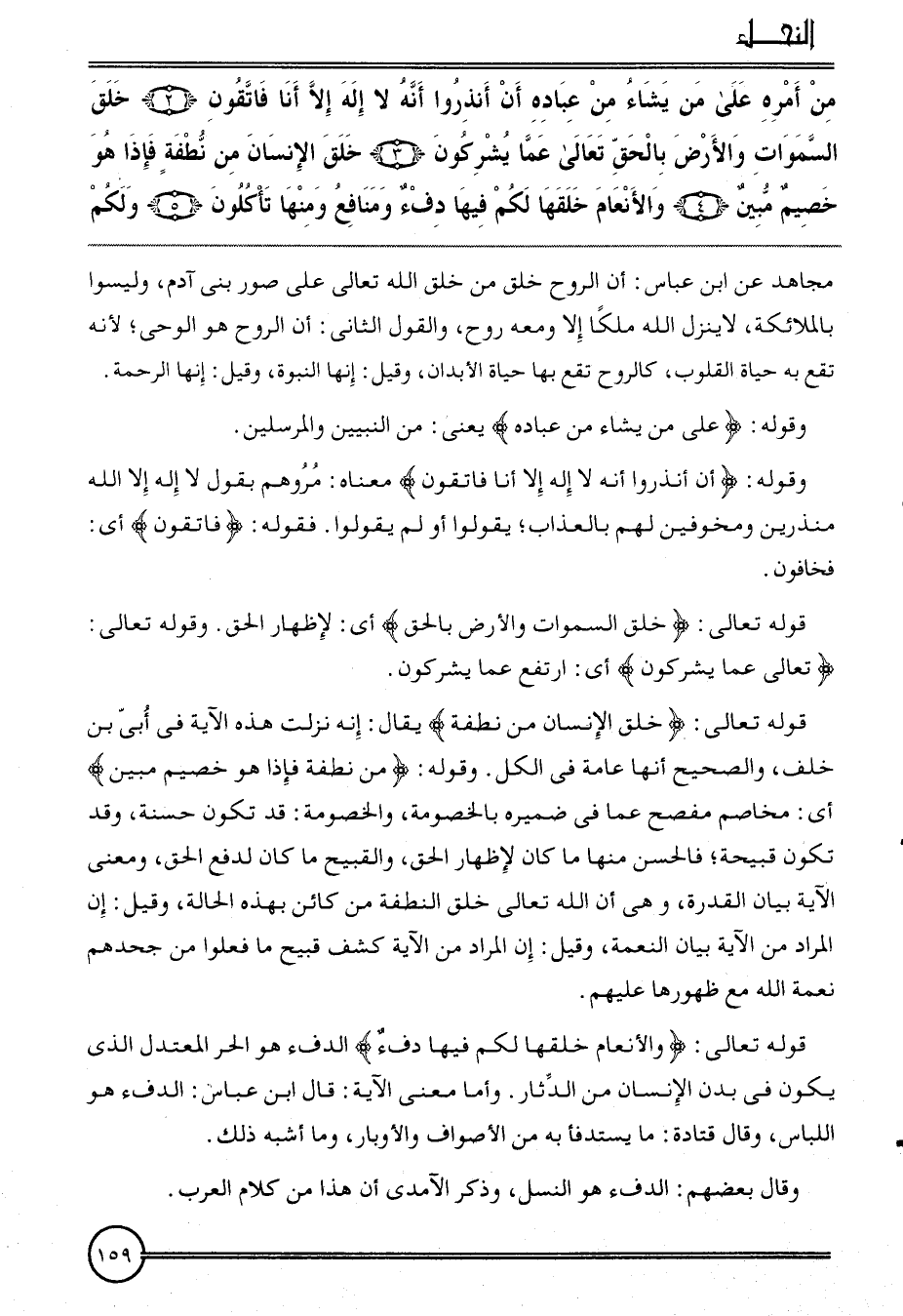 {من أمره على من يَشَاء من عباده أَن أنذروا أَنه لَا إِلَه إِلَّا أَنا فاتقون (2) خلق السَّمَوَات وَالْأَرْض بِالْحَقِّ تَعَالَى عَمَّا يشركُونَ (3) خلق الْإِنْسَان من نُطْفَة فَإِذا هُوَ خصيم مُبين (4) والأنعام خلقهَا لكم فِيهَا دفء وَمَنَافع وَمِنْهَا تَأْكُلُونَ (5) وَلكم} مُجَاهِد عَن ابْن عَبَّاس: أَن الرّوح خلق من خلق الله تَعَالَى على صور بني آدم، وَلَيْسوا بِالْمَلَائِكَةِ، لَا ينزل الله ملكا إِلَّا وَمَعَهُ روح، وَالْقَوْل الثَّانِي: أَن الرّوح هُوَ الْوَحْي؛ لِأَنَّهُ تقع بِهِ حَيَاة الْقُلُوب، كالروح تقع بهَا حَيَاة الْأَبدَان، وَقيل: إِنَّهَا النُّبُوَّة، وَقيل: إِنَّهَا الرَّحْمَة.