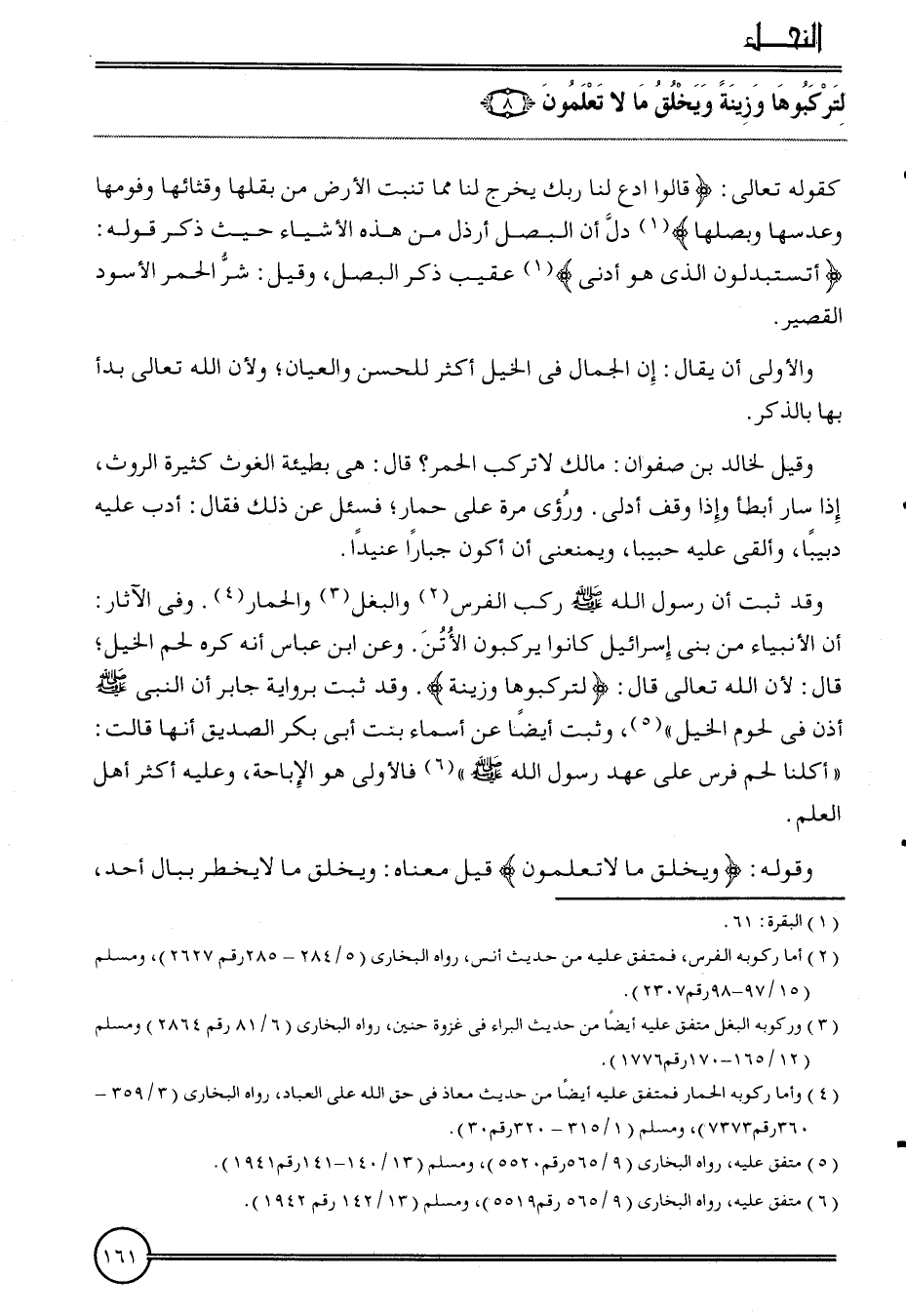 {لتركبوها وزينة ويخلق مَا لَا تعلمُونَ (8) } كَقَوْلِه تَعَالَى: {قَالُوا ادْع لنا رَبك يخرج لنا مِمَّا تنْبت الأَرْض من بقلها وقثائها وفومها وعدسها وبصلها} دلّ أَن البصل أرذل من هَذِه الْأَشْيَاء حَيْثُ ذكر قَوْله: {أتستبدلون الَّذِي هُوَ أدنى} عقيب ذكر البصل، وَقيل: شَرّ الْحمر الْأسود الْقصير.