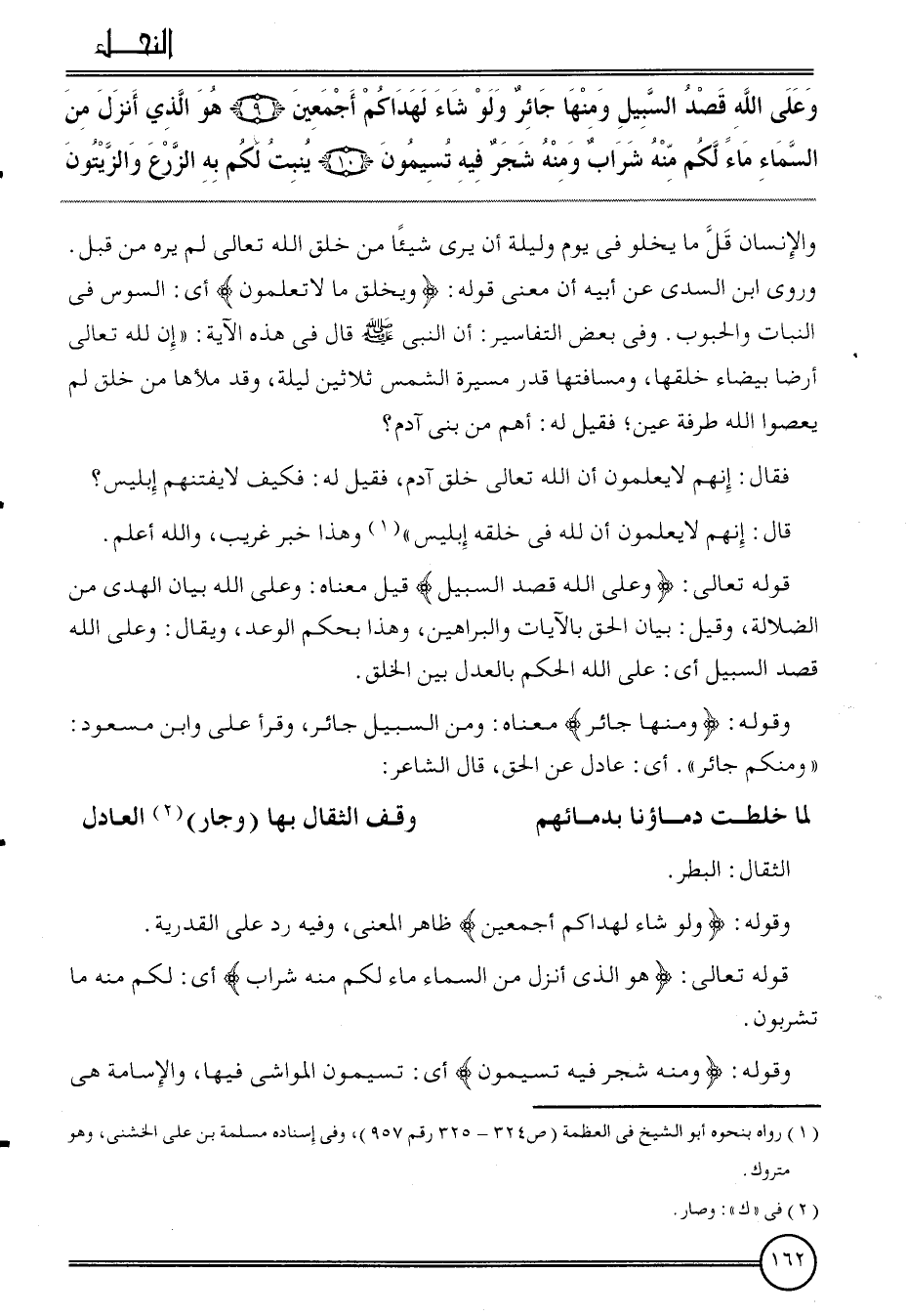 {وعَلى الله قصد السَّبِيل وَمِنْهَا جَائِر وَلَو شَاءَ لهداكم أَجْمَعِينَ (9) هُوَ الَّذِي أنزل من السَّمَاء مَاء لكم مِنْهُ شراب وَمِنْه شجر فِيهِ تسيمون (10) ينْبت لكم بِهِ الزَّرْع وَالزَّيْتُون} وَالْإِنْسَان قل مَا يَخْلُو فِي يَوْم وَلَيْلَة أَن يرى شَيْئا من خلق الله تَعَالَى لم يره من قبل. وروى ابْن السّديّ عَن أَبِيه أَن معنى قَوْله: {ويخلق مَا لَا تعلمُونَ} أَي: السوس فِي النَّبَات والحبوب. وَفِي بعض التفاسير: أَن النَّبِي قَالَ فِي هَذِه الْآيَة: " إِن لله تَعَالَى أَرضًا بَيْضَاء خلقهَا، ومسافتها قدر مسيرَة الشَّمْس ثَلَاثِينَ لَيْلَة، وَقد ملأها من خلق لم يعصوا الله طرفَة عين؛ فَقيل لَهُ: أهم من بني آدم؟