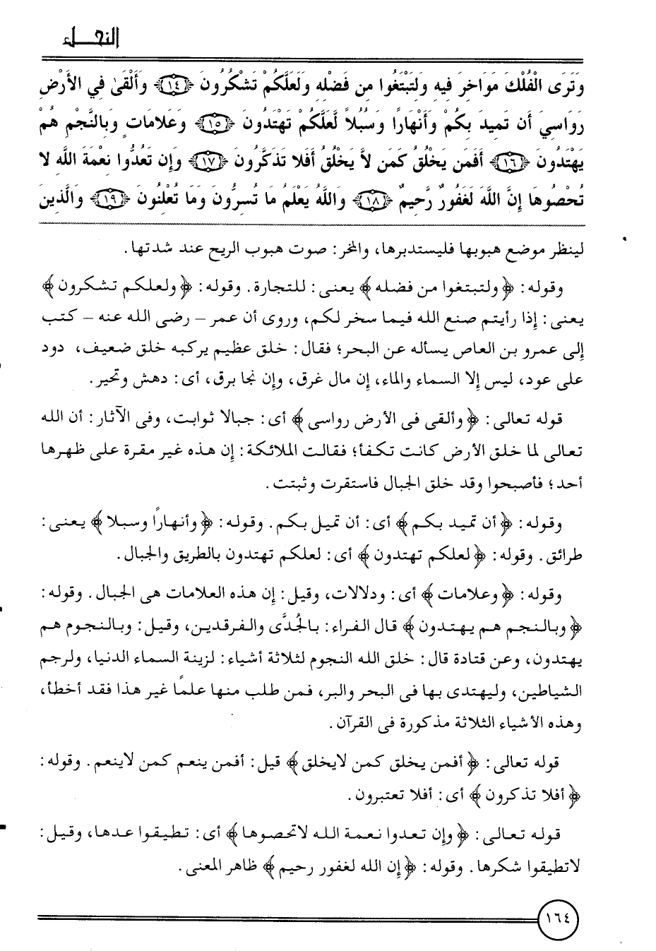{وَترى الْفلك مواخر فِيهِ ولتبتغوا من فَضله ولعلكم تشكرون (14) وَألقى فِي الأَرْض رواسي أَن تميد بكم وأنهارا وسبلا لَعَلَّكُمْ تهتدون (15) وعلامات وبالنجم هم يَهْتَدُونَ (16) أَفَمَن يخلق كمن لَا يخلق أَفلا تذكرُونَ (17) وَإِن تعدوا نعْمَة الله لَا تحصوها إِن الله لغَفُور رَحِيم (18) وَالله يعلم مَا تسرون وَمَا تعلنون (19) وَالَّذين} لينْظر مَوضِع هبوبها فليستدبرها، والمخر: صَوت هبوب الرّيح عِنْد شدتها.