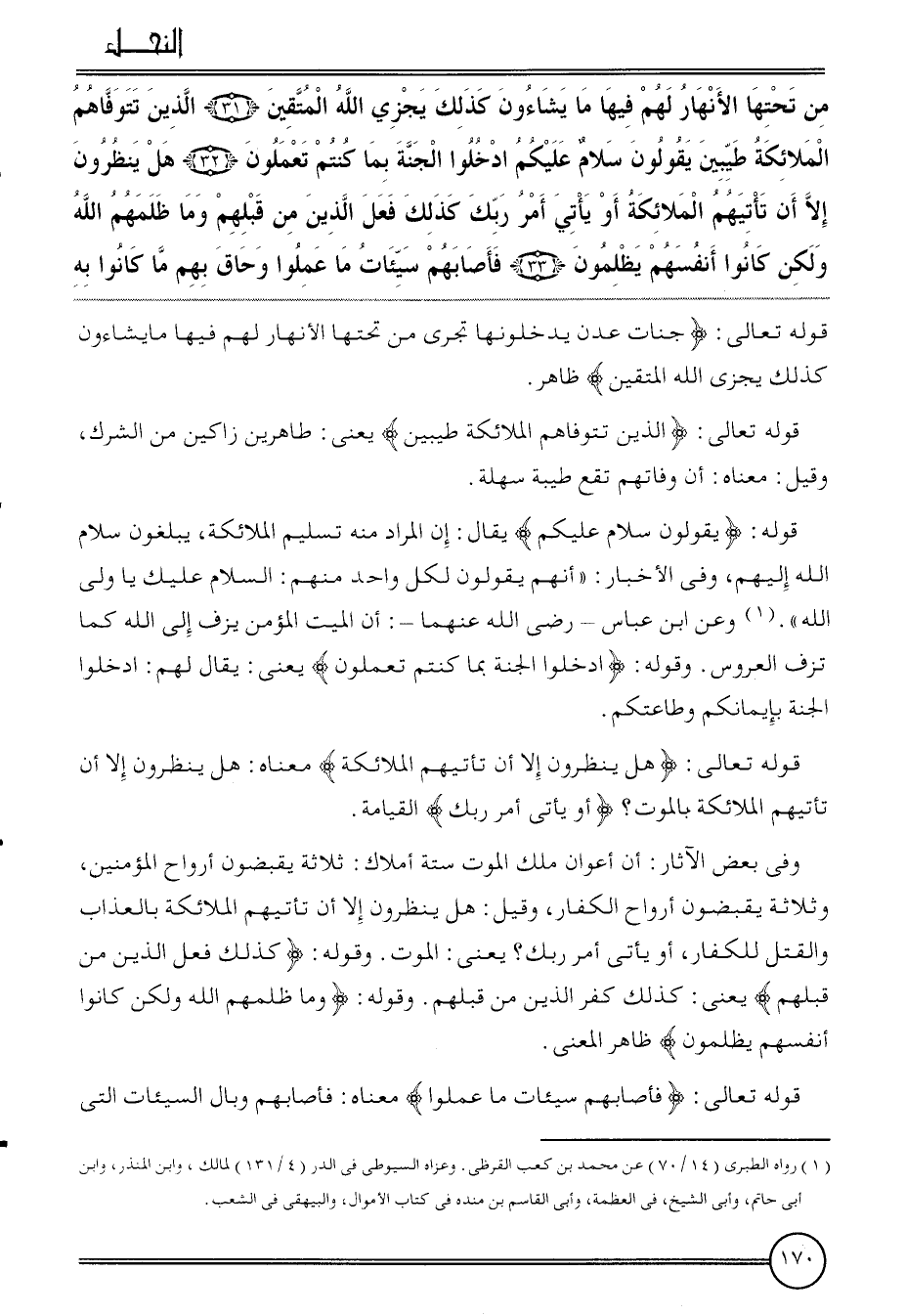 {من تحتهَا الْأَنْهَار لَهُم فِيهَا مَا يشاءون كَذَلِك يَجْزِي الله الْمُتَّقِينَ (31) الَّذين تتوفاهم الْمَلَائِكَة طيبين يَقُولُونَ سَلام عَلَيْكُم ادخُلُوا الْجنَّة بِمَا كُنْتُم تَعْمَلُونَ (32) هَل ينظرُونَ إِلَّا أَن تأتيهم الْمَلَائِكَة أَو يَأْتِي أَمر رَبك كَذَلِك فعل الَّذين من قبلهم وَمَا ظلمهم الله وَلَكِن كَانُوا أنفسهم يظْلمُونَ (33) فَأَصَابَهُمْ سيئات مَا عمِلُوا وحاق بهم مَا كَانُوا بِهِ}