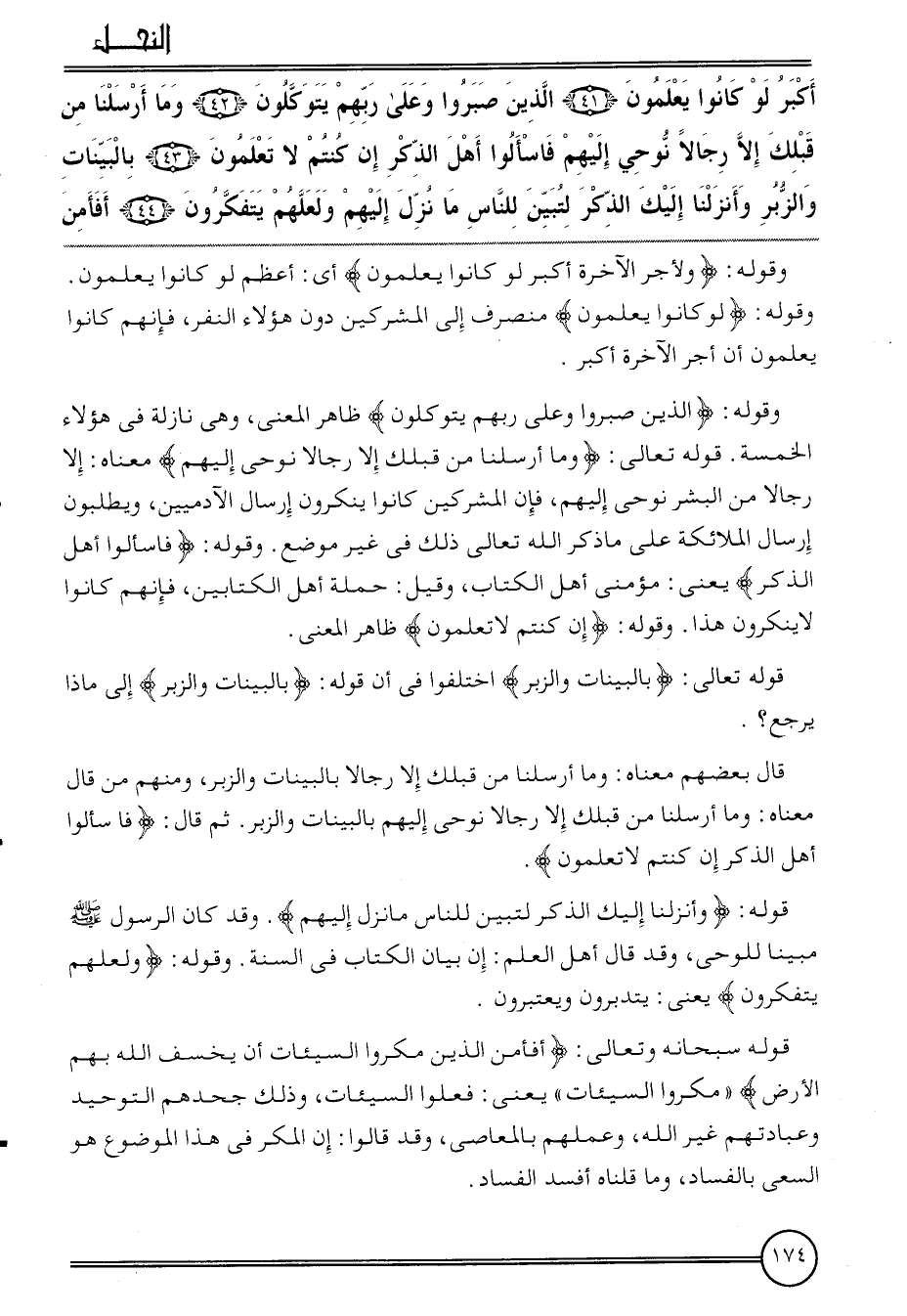 {أكبر لَو كَانُوا يعلمُونَ (41) الَّذين صَبَرُوا وعَلى رَبهم يَتَوَكَّلُونَ (42) وَمَا أرسلنَا من قبلك إِلَّا رجَالًا نوحي إِلَيْهِم فاسألوا أهل الذّكر إِن كُنْتُم لَا تعلمُونَ (43) بِالْبَيِّنَاتِ والزبر وأنزلنا إِلَيْك الذّكر لتبين للنَّاس مَا نزل إِلَيْهِم ولعلهم يتفكرون (44) أفأمن}