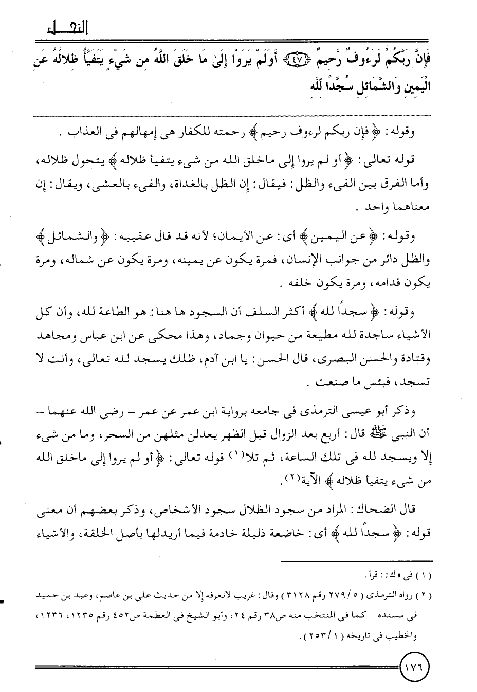 وَذكر أَبُو عِيسَى التِّرْمِذِيّ فِي جَامعه بِرِوَايَة ابْن عمر عَن عمر - رَضِي الله عَنْهُمَا - أَن النَّبِي قَالَ: أَربع بعد الزَّوَال قبل الظّهْر يعدلن مِثْلهنَّ من السحر، وَمَا من شَيْء إِلَّا وَيسْجد لله فِي تِلْكَ السَّاعَة، ثمَّ تَلا قَوْله تَعَالَى: {أولم يرَوا إِلَى مَا خلق الله من شَيْء يتفيأ ظلاله} الْآيَة.