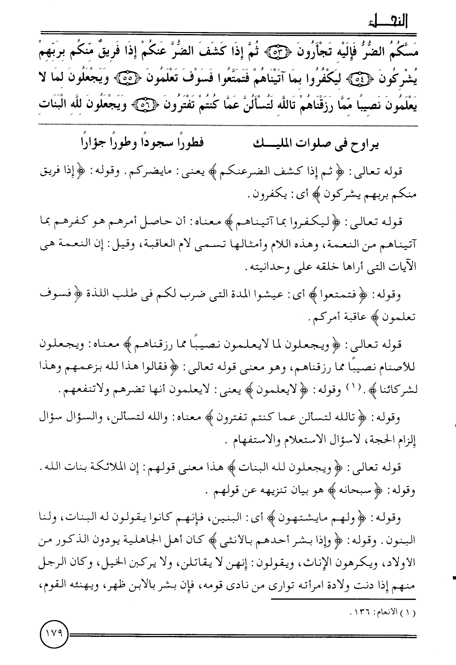 {مسكم الضّر فإليه تجأرون (53) ثمَّ إِذا كشف الضّر عَنْكُم إِذا فريق مِنْكُم برَبهمْ يشركُونَ (54) ليكفروا بِمَا آتَيْنَاهُم فتمتعوا فَسَوف تعلمُونَ (55) ويجعلون لما لَا يعلمُونَ نَصِيبا مِمَّا رَزَقْنَاهُمْ تالله لتسألن عَمَّا كُنْتُم تفترون (56) ويجعلون لله الْبَنَات}