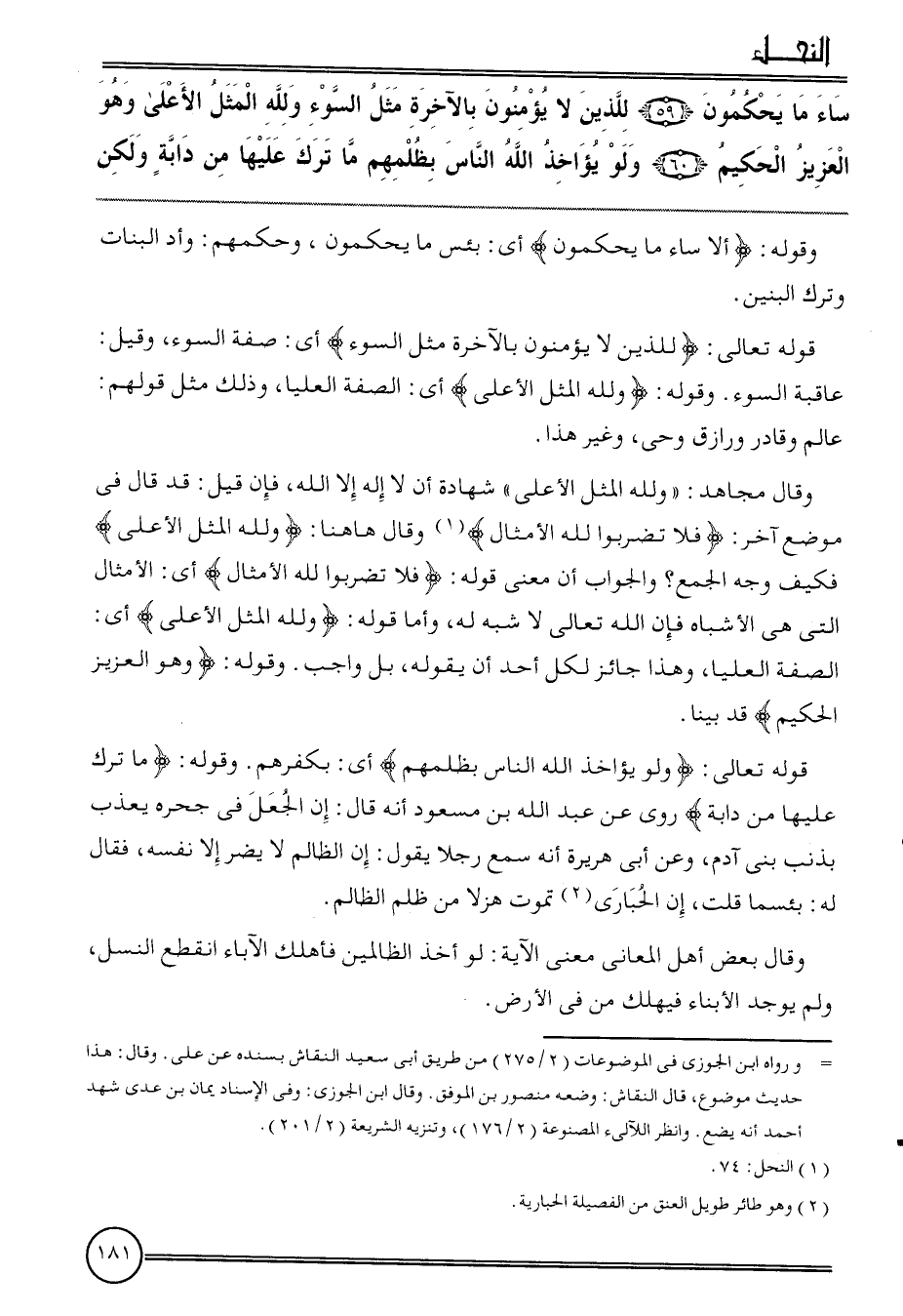 {سَاءَ مَا يحكمون (59) للَّذين لَا يُؤمنُونَ بِالآخِرَة مثل السوء وَللَّه الْمثل الْأَعْلَى وَهُوَ الْعَزِيز الْحَكِيم (60) وَلَو يُؤَاخذ الله النَّاس بظلمهم مَا ترك عَلَيْهَا من دَابَّة وَلَكِن}