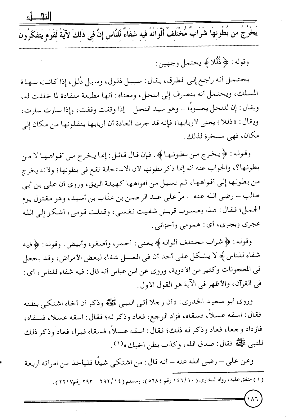 وَقَوله: {شراب مُخْتَلف ألوانه} يَعْنِي: أَحْمَر، وأصفر، وأبيض. وَقَوله: {فِيهِ شِفَاء للنَّاس} لَا يشكل على أحد أَن فِي الْعَسَل شِفَاء لبَعض الْأَمْرَاض، وَقد يَجْعَل فِي المعجونات وَكثير من الْأَدْوِيَة، وَرُوِيَ عَن ابْن عَبَّاس أَنه قَالَ: فِيهِ شِفَاء للنَّاس، أَي: فِي الْقُرْآن، وَالْأَظْهَر فِي الْآيَة هُوَ القَوْل الأول.