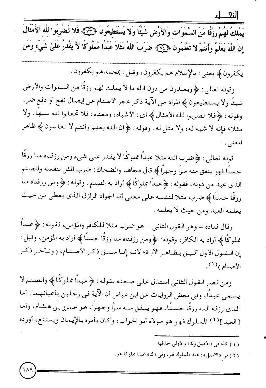 وَقَالَ قَتَادَة - وَهُوَ القَوْل الثَّانِي - هُوَ ضرب مثلا للْكَافِرِ وَالْمُؤمن، فَقَوله: {عبدا مَمْلُوكا} أَرَادَ بِهِ الْكَافِر، وَقَوله: {وَمن رزقناه منا رزقا حسنا} أَرَادَ بِهِ الْمُؤمن، وَقيل: إِن القَوْل الأول أليق بِظَاهِر الْآيَة؛ لِأَنَّهُ إِنَّمَا سبق ذكر الْأَصْنَام، (وَتَأَخر ذكر الْأَصْنَام) .
