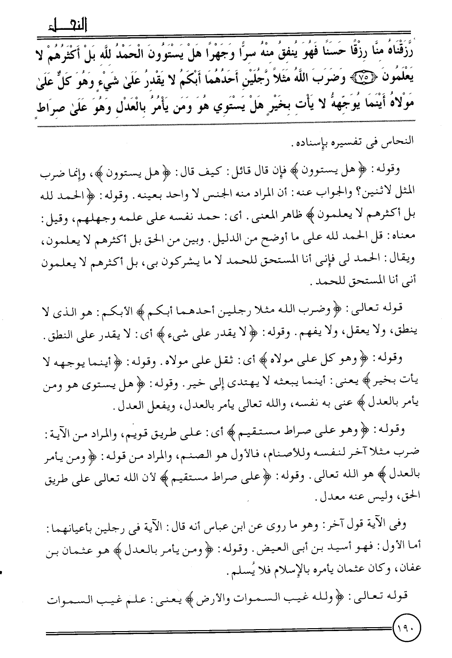 {رزقناه منا رزقا حسنا فَهُوَ ينْفق مِنْهُ سرا وجهرا هَل يستوون الْحَمد لله بل أَكْثَرهم لَا يعلمُونَ (75) وَضرب الله مثلا رجلَيْنِ أَحدهمَا أبكم لَا يقدر على شَيْء وَهُوَ كل على مَوْلَاهُ أَيْنَمَا يوجهه لَا يَأْتِ بِخَير هَل يَسْتَوِي هُوَ وَمن يَأْمر بِالْعَدْلِ وَهُوَ على صِرَاط} النّحاس فِي تَفْسِيره بِإِسْنَادِهِ.
