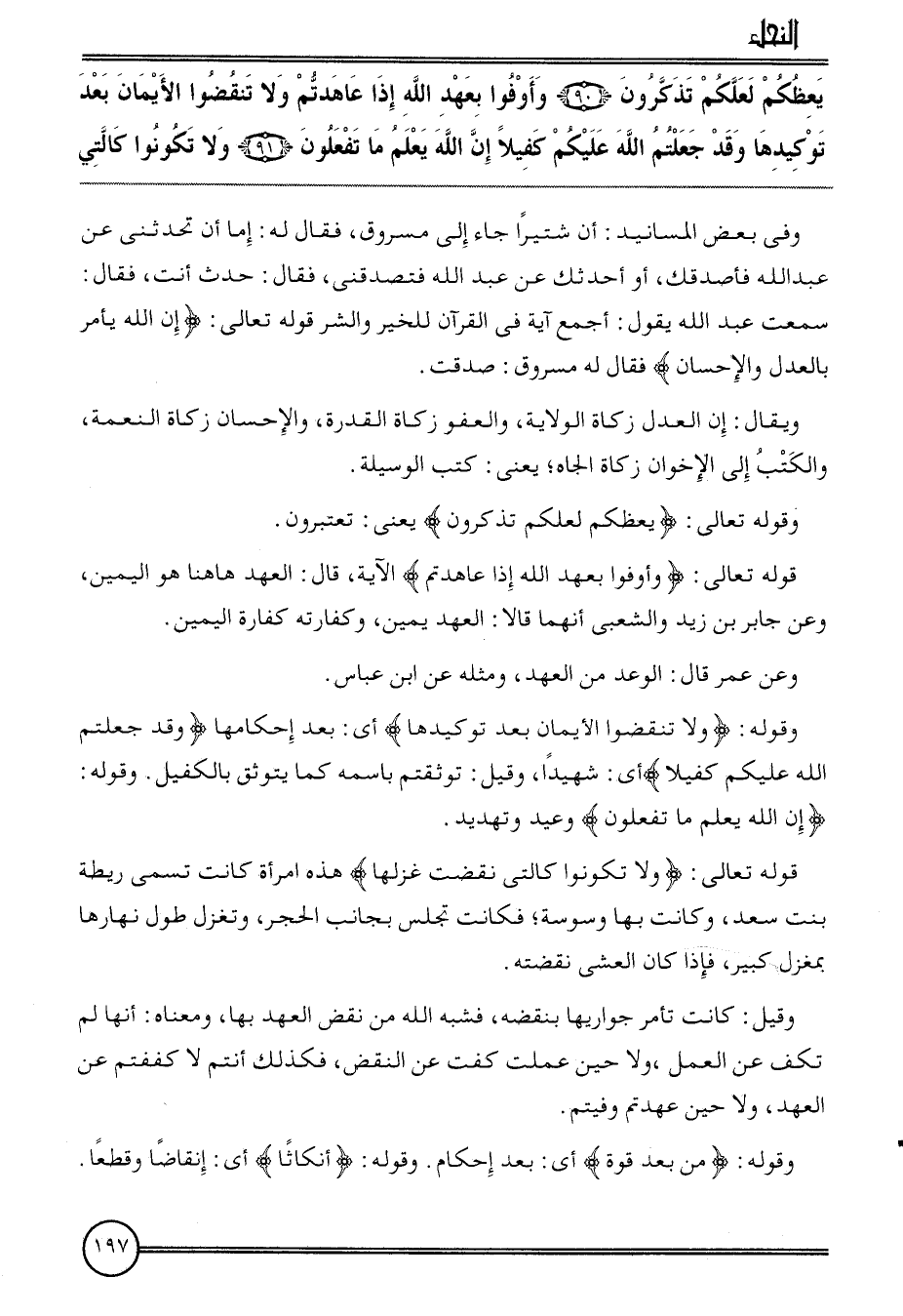 {يعظكم لَعَلَّكُمْ تذكرُونَ (90) وأوفوا بِعَهْد الله إِذا عاهدتم وَلَا تنقضوا الْأَيْمَان بعد توكيدها وَقد جعلتم الله عَلَيْكُم كَفِيلا إِن الله يعلم مَا تَفْعَلُونَ (91) وَلَا تَكُونُوا كَالَّتِي}