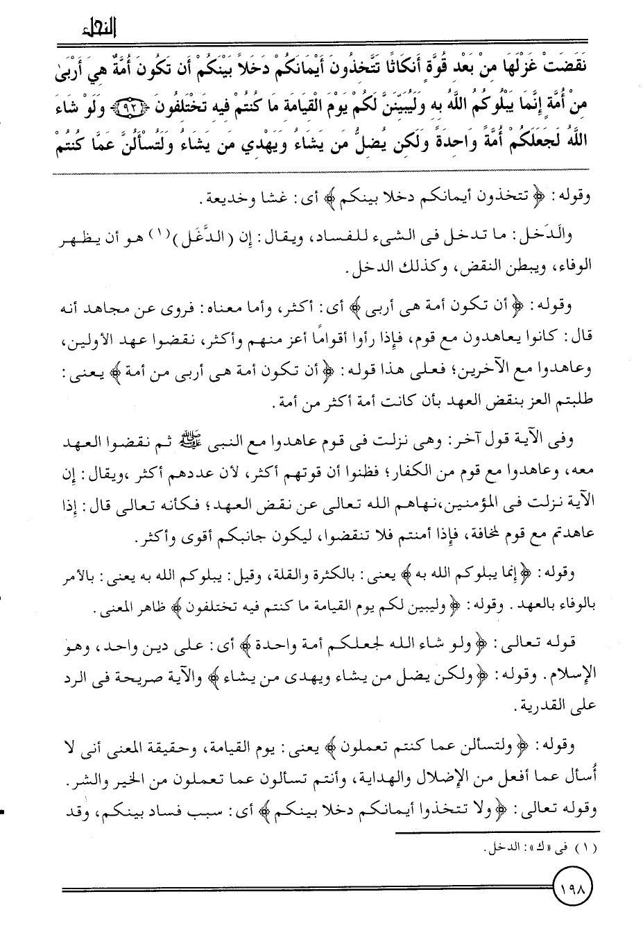 {نقضت غزلها من بعد قُوَّة أنكاثا تَتَّخِذُونَ أَيْمَانكُم دخلا بَيْنكُم أَن تكون أمة هِيَ أربى من أمة إِنَّمَا يبلوكم الله بِهِ وليبينن لكم يَوْم الْقِيَامَة مَا كُنْتُم فِيهِ تختلفون (92) وَلَو شَاءَ الله لجعلكم أمة وَاحِدَة وَلَكِن يضل من يَشَاء وَيهْدِي من يَشَاء ولتسألن عَمَّا كُنْتُم} وَقَوله: {تَتَّخِذُونَ أَيْمَانكُم دخلا بَيْنكُم} أَي: غشا وخديعة.