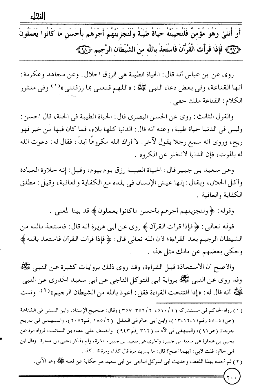 {أَو أُنْثَى وَهُوَ مُؤمن فلنحيينه حَيَاة طيبَة ولنجزينهم أجرهم بِأَحْسَن مَا كَانُوا يعْملُونَ (97) فَإِذا قَرَأت الْقُرْآن فاستعذ بِاللَّه من الشَّيْطَان الرَّجِيم (98) }