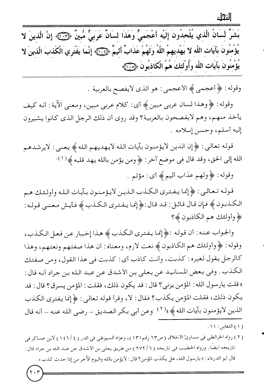 {بشر لِسَان الَّذِي يلحدون إِلَيْهِ أعجمي وَهَذَا لِسَان عَرَبِيّ مُبين (103) إِن الَّذين لَا يُؤمنُونَ بآيَات الله لَا يهْدِيهم الله وَلَهُم عَذَاب أَلِيم (104) إِنَّمَا يفتري الْكَذِب الَّذين لَا يُؤمنُونَ بآيَات الله وَأُولَئِكَ هم الْكَاذِبُونَ (105) } وَقَوله: {أعجمي} الأعجمي: هُوَ الَّذِي لَا يفصح بِالْعَرَبِيَّةِ.
