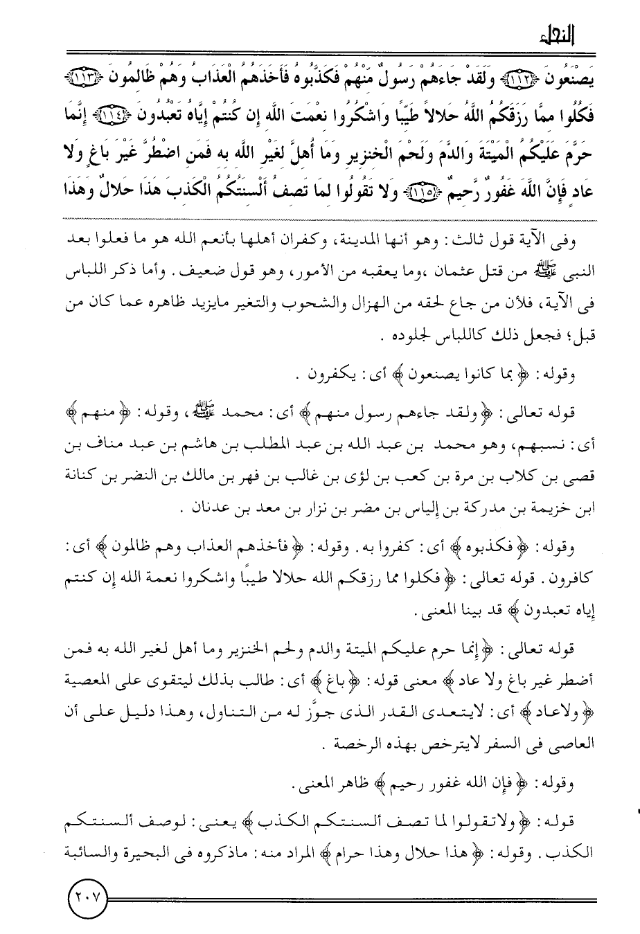 {يصنعون (112) وَلَقَد جَاءَهُم رَسُول مِنْهُم فَكَذبُوهُ فَأَخذهُم الْعَذَاب وهم ظَالِمُونَ (113) فَكُلُوا مِمَّا رزقكم الله حَلَال طيبا واشكروا نعمت الله إِن كُنْتُم إِيَّاه تَعْبدُونَ (114) إِنَّمَا حرم عَلَيْكُم الْميتَة وَالدَّم وَلحم الْخِنْزِير وَمَا أهل لغير الله بِهِ فَمن اضْطر غير بَاغ وَلَا عَاد فَإِن الله غَفُور رَحِيم (115) وَلَا تَقولُوا لما تصف أَلْسِنَتكُم الْكَذِب هَذَا حَلَال وَهَذَا}