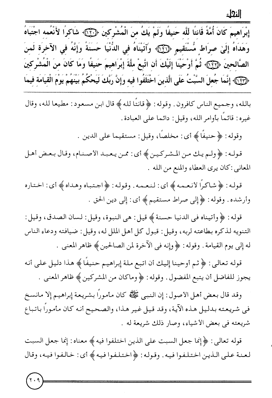 {إِبْرَاهِيم كَانَ أمة قَانِتًا لله حَنِيفا وَلم يَك من الْمُشْركين (120) شاكرا لأنعمه اجتباه وهداه إِلَى صِرَاط مُسْتَقِيم (121) وَآتَيْنَاهُ فِي الدُّنْيَا حَسَنَة وَإنَّهُ فِي الْآخِرَة لمن الصَّالِحين (122) ثمَّ أَوْحَينَا إِلَيْك أَن ابتع مِلَّة إِبْرَاهِيم حَنِيفا وَمَا كَانَ من الْمُشْركين (123) إِنَّمَا جعل السبت على الَّذين اخْتلفُوا فِيهِ وَإِن رَبك ليحكم بَينهم يَوْم الْقِيَامَة فِيمَا} بِاللَّه، وَجَمِيع النَّاس كافرون. وَقَوله: {قَانِتًا لله} قَالَ ابْن مَسْعُود: مُطيعًا لله، وَقَالَ غَيره: قَائِما بأوامر الله، وَقيل: دَائِما على الْعِبَادَة.