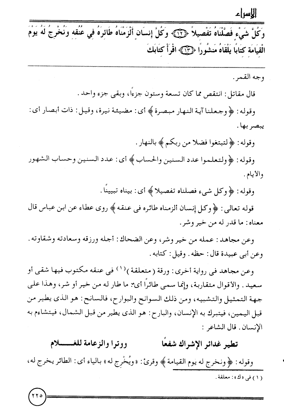 {وكل شَيْء فصلناه تَفْصِيلًا (12) وكل إِنْسَان ألزمناه طَائِره فِي عُنُقه وَنخرج لَهُ يَوْم الْقِيَامَة كتابا يلقاه منشورا (13) اقْرَأ كتابك} وَجه الْقَمَر.