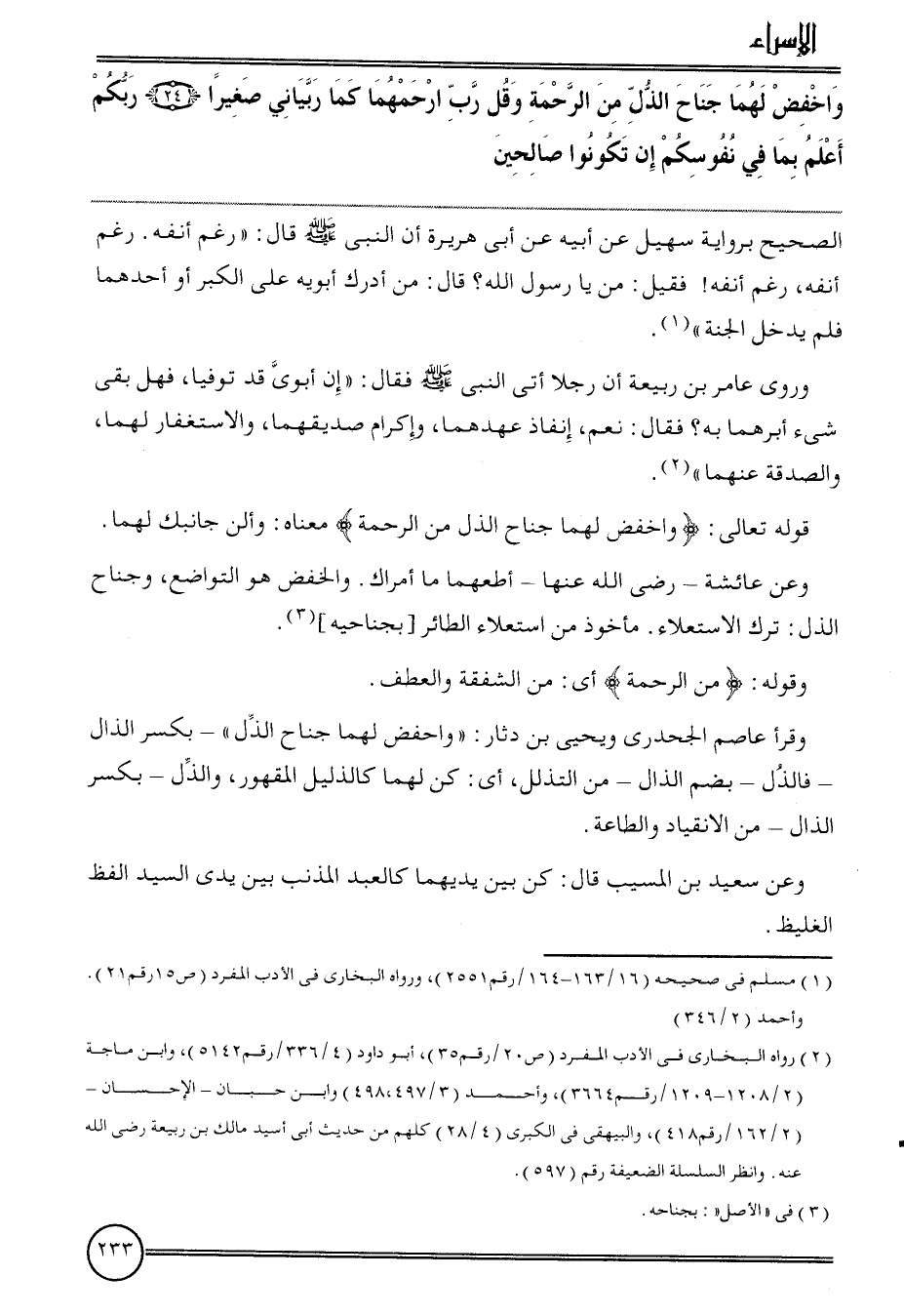 {واخفض لَهما جنَاح الذل من الرَّحْمَة وَقل رب ارحمهما كَمَا ربياني صَغِيرا (24) ربكُم أعلم بِمَا فِي نفوسكم إِن تَكُونُوا صالحين} الصَّحِيح بِرِوَايَة سُهَيْل عَن أَبِيه عَن أبي هُرَيْرَة أَن النَّبِي قَالَ: " رغم أَنفه. رغم أَنفه، رغم أَنفه! فَقيل: من يَا رَسُول الله؟ قَالَ: من أدْرك أَبَوَيْهِ على الْكبر أَو أَحدهمَا فَلم يدْخل الْجنَّة ".