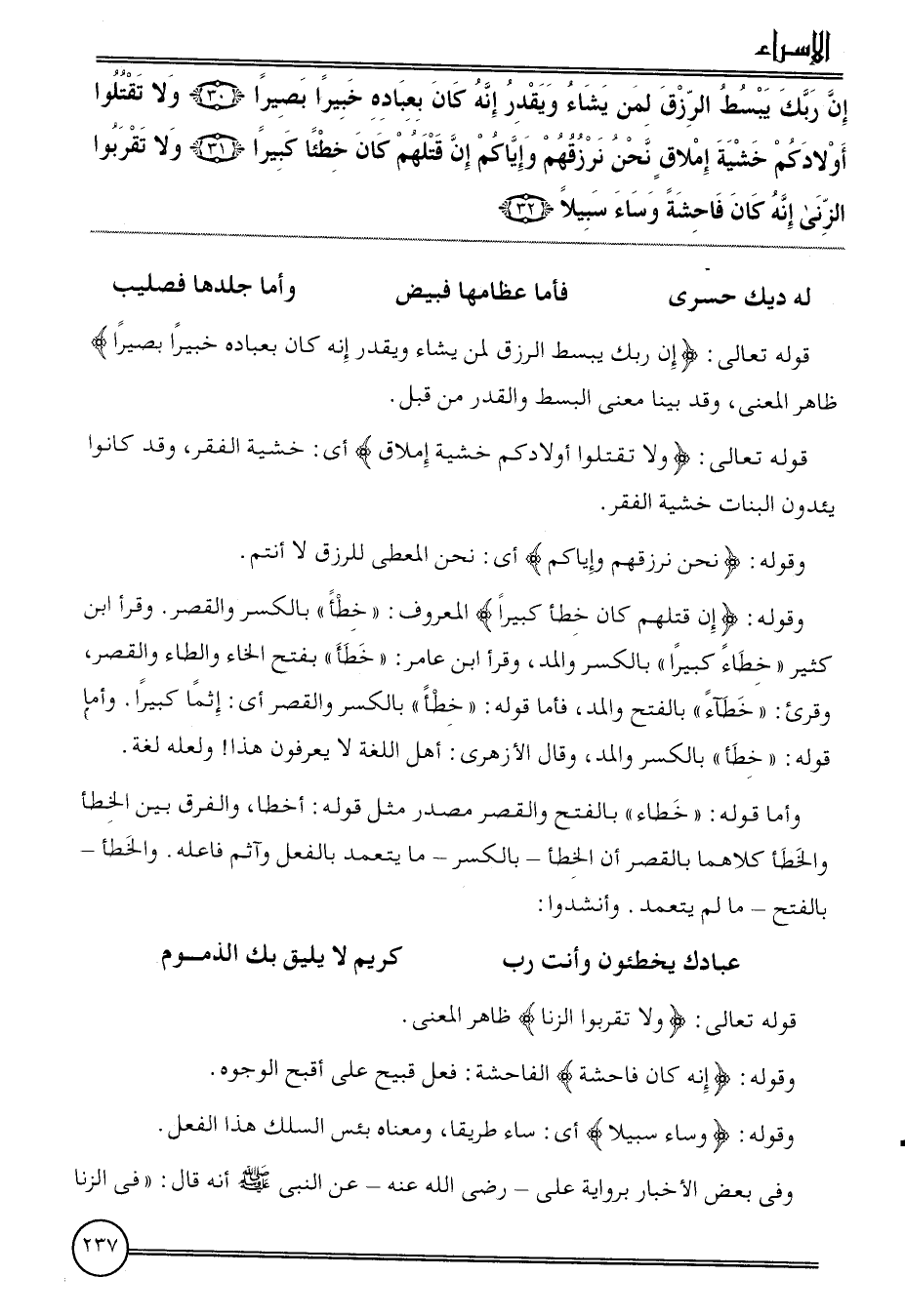 {إِن رَبك يبسط الرزق لمن يَشَاء وَيقدر إِنَّه كَانَ بعباده خَبِيرا بَصيرًا (30) وَلَا تقتلُوا أَوْلَادكُم خشيَة إملاق نَحن نرزقكم وَإِيَّاكُم إِن قَتلهمْ كَانَ خطئا كَبِيرا (31) وَلَا تقربُوا الزِّنَى إِنَّه كَانَ فَاحِشَة وساء سَبِيلا (32) }
