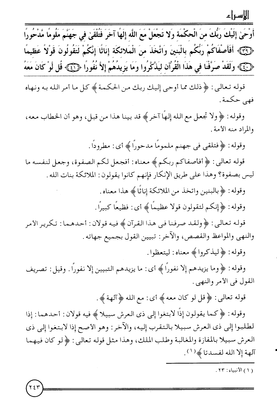 {أوحى إِلَيْك رَبك من الْحِكْمَة وَلَا تجْعَل مَعَ الله إِلَهًا آخر فَتلقى فِي جَهَنَّم ملوما مَدْحُورًا (39) أفأصفاكم ربكُم بالبنين وَاتخذ من الْمَلَائِكَة إِنَاثًا إِنَّكُم لتقولون قولا عَظِيما (40) وَلَقَد صرفنَا فِي هَذَا الْقُرْآن لِيذكرُوا وَمَا يزيدهم إِلَّا نفورا (41) قل لَو كَانَ مَعَه}
