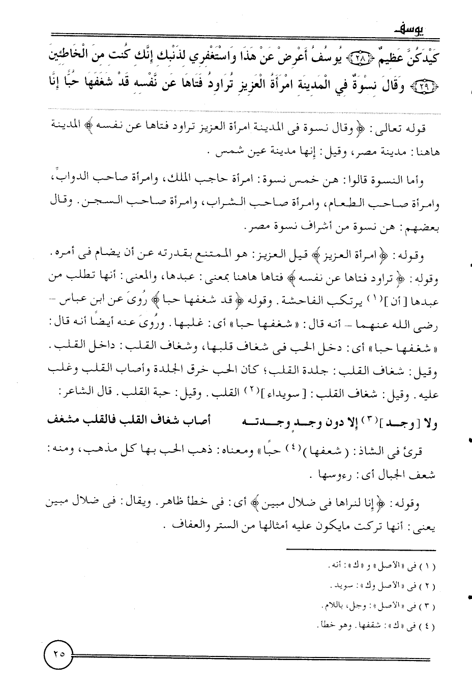 وَقَوله: {امْرَأَة الْعَزِيز} قيل الْعَزِيز: هُوَ الْمُمْتَنع بقدرته عَن أَن يضام فِي أمره. وَقَوله: {تراود فتاها عَن نَفسه} فتاها هَاهُنَا بِمَعْنى: عَبدهَا، وَالْمعْنَى: أَنَّهَا تطلب من عَبدهَا [أَن] يرتكب الْفَاحِشَة. وَقَوله {قد شغفها حبا} رُوِيَ عَن ابْن عَبَّاس - رَضِي الله عَنْهَا - أَنه قَالَ: " شغفها حبا " أَي: غلبها. وَرُوِيَ عَنهُ أَيْضا أَنه قَالَ: " شغفها حبا " أَي: دخل الْحبّ فِي شغَاف قَلبهَا، وشغاف الْقلب: دَاخل الْقلب. وَقيل: شغَاف الْقلب: جلدَة الْقلب؛ كَأَن الْحبّ خرق الْجلْدَة وَأصَاب الْقلب وَغلب عَلَيْهِ. وَقيل: شغَاف الْقلب: [سويداء] الْقلب. وَقيل: حَبَّة الْقلب. قَالَ الشَّاعِر:
