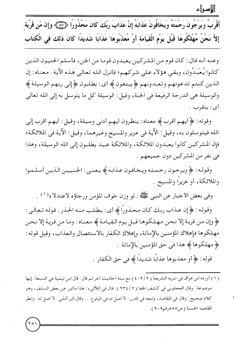 {أقرب ويرجون رَحمته وَيَخَافُونَ عَذَابه إِن عَذَاب رَبك كَانَ محذورا (57) وَإِن من قَرْيَة إِلَّا نَحن مهلكوها قبل يَوْم الْقِيَامَة أَو معذبوها عذَابا شَدِيدا كَانَ ذَلِك فِي الْكتاب} وَعنهُ أَنه قَالَ: كَانَ قوم من الْمُشْركين يعْبدُونَ قوما من الْجِنّ، فَأسلم الجنيون الَّذين كَانُوا يعْبدُونَ، وَبَقِي هَؤُلَاءِ على شركهم؛ فَأنْزل الله تَعَالَى هَذِه الْآيَة. مَعْنَاهُ: إِن الَّذين كُنْتُم تدعونهم وتعبدونهم {يَبْتَغُونَ} أَي: يطْلبُونَ {إِلَى رَبهم الْوَسِيلَة} والوسيلة هِيَ الدرجَة الرفيعة فِي الْجنَّة، وَقيل: الْوَسِيلَة كل مَا يتوسل بِهِ إِلَى الله تَعَالَى أَي: يتَقرَّب.
