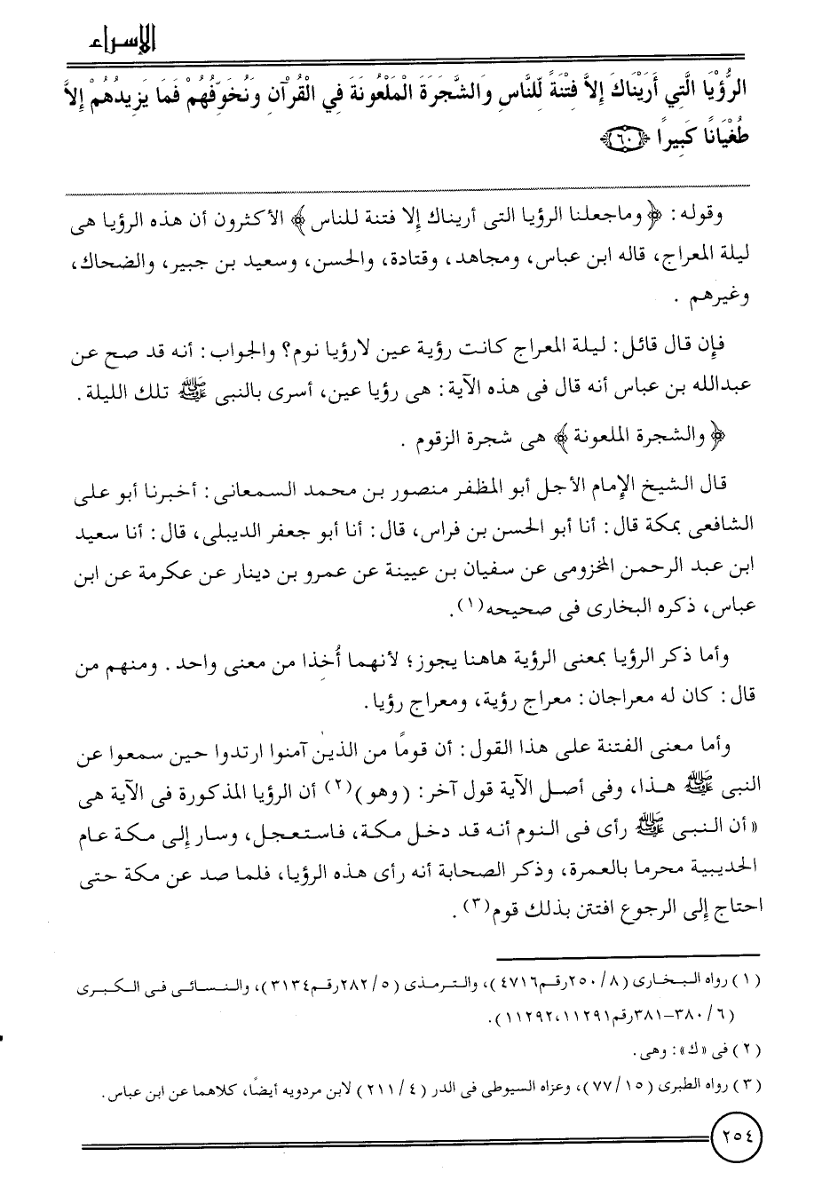 وَقَوله: {وَمَا جعلنَا الرُّؤْيَا الَّتِي أريناك إِلَّا فتْنَة للنَّاس} الْأَكْثَرُونَ أَن هَذِه الرُّؤْيَا هِيَ لَيْلَة الْمِعْرَاج، قَالَه ابْن عَبَّاس، وَمُجاهد، وَقَتَادَة، وَالْحسن، وَسَعِيد بن جُبَير، وَالضَّحَّاك، وَغَيرهم.