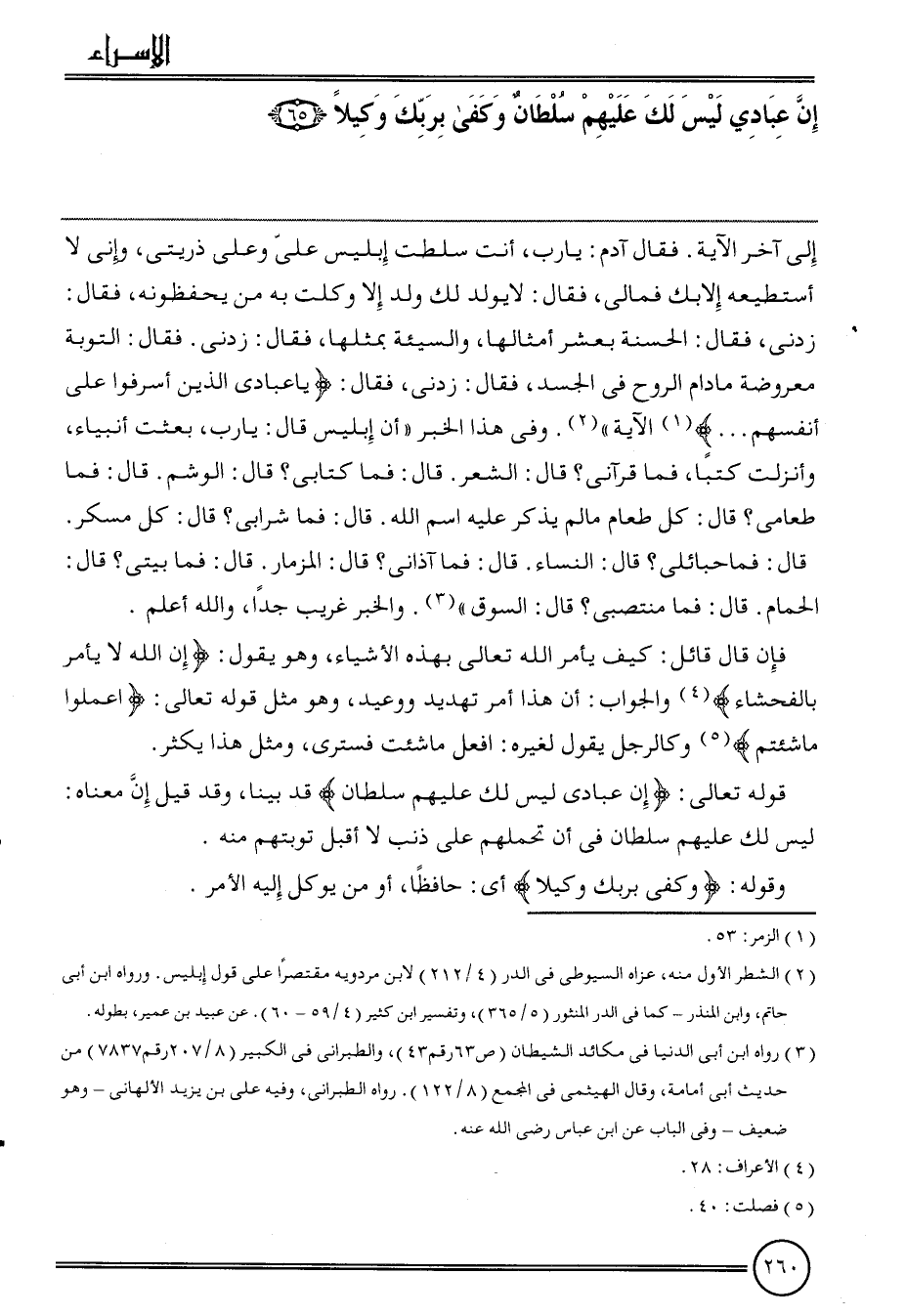 {إِن عبَادي لَيْسَ لَك عَلَيْهِم سُلْطَان وَكفى بِرَبِّك وَكيلا (65) } إِلَى آخر الْآيَة. فَقَالَ آدم: يَا رب، أَنْت سلطت إِبْلِيس عَليّ وعَلى ذريتي، وَإِنِّي لَا أستطيعه إِلَّا بك فَمَالِي، فَقَالَ: لَا يُولد لَك ولد إِلَّا وكلت بِهِ من يَحْفَظُونَهُ، فَقَالَ: زِدْنِي، فَقَالَ: الْحَسَنَة بِعشر أَمْثَالهَا، والسيئة بِمِثْلِهَا، فَقَالَ: زِدْنِي. فَقَالَ: التَّوْبَة معروضة مادام الرّوح فِي الْجَسَد، فَقَالَ: زِدْنِي، فَقَالَ: {يَا عبَادي الَّذين أَسْرفُوا على أنفسهم} الْآيَة ". وَفِي هَذَا الْخَبَر " أَن إِبْلِيس قَالَ: يَا رب، بعثت أَنْبيَاء، وأنزلت كتبا، فَمَا قرآني؟ قَالَ: الشّعْر. قَالَ: فَمَا كتابي؟ قَالَ: الوشم. قَالَ: فَمَا طَعَامي؟ قَالَ: كل طَعَام مَا لم يذكر عَلَيْهِ اسْم الله. قَالَ: فَمَا شرابي؟ قَالَ: كل مُسكر. قَالَ: فَمَا حبائلي؟ قَالَ: النِّسَاء. قَالَ: فَمَا آذَانِي؟ قَالَ المزمار. قَالَ: فَمَا بَيْتِي؟ قَالَ: الْحمام. قَالَ: فَمَا منتصبي؟ قَالَ: السُّوق ". وَالْخَبَر غَرِيب جدا، وَالله أعلم.