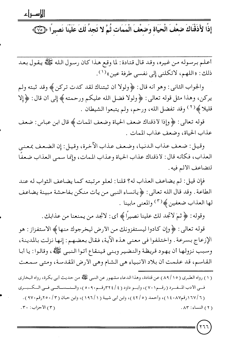 {إِذا لأذقناك ضعف الْحَيَاة وَضعف الْمَمَات ثمَّ لَا تَجِد لَك علينا نَصِيرًا (75) } أعلم بِرَسُولِهِ من غَيره، وَقد قَالَ قَتَادَة: لما وَقع هَذَا كَانَ رَسُول الله يَقُول بعد ذَلِك: " اللَّهُمَّ، لَا تَكِلنِي إِلَى نَفسِي طرفَة عين ".