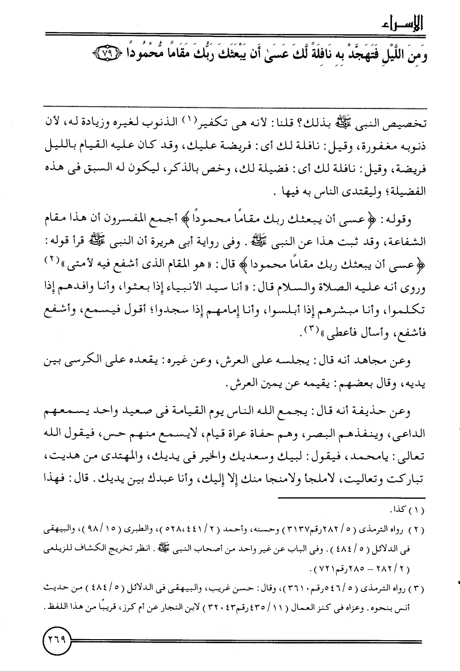 وَقَوله: {عَسى أَن يَبْعَثك رَبك مقَاما مَحْمُودًا} أجمع الْمُفَسِّرُونَ أَن هَذَا مقَام الشَّفَاعَة، وَقد ثَبت هَذَا عَن النَّبِي. وَفِي رِوَايَة أبي هُرَيْرَة أَن النَّبِي قَرَأَ قَوْله: {عَسى أَن يَبْعَثك رَبك مقَاما مَحْمُودًا} قَالَ: " هُوَ الْمقَام الَّذِي أشفع فِيهِ لأمتي " وَرُوِيَ أَنه عَلَيْهِ الصَّلَاة وَالسَّلَام قَالَ: " أَنا سيد الْأَنْبِيَاء إِذا بعثوا، وَأَنا وافدهم إِذا تكلمُوا، وَأَنا مبشرهم إِذا أبلسوا، وَأَنا إمَامهمْ إِذا سجدوا؛ أَقُول فليسمع، وأشفع فأشفع، وأسأل فَأعْطِي ".