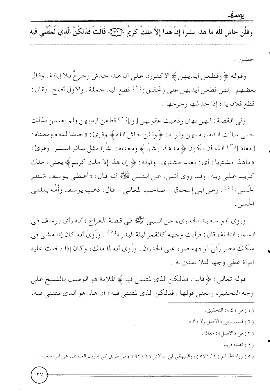 وَفِي الْقِصَّة: أَنَّهُنَّ بهتن وَذَهَبت عقولهن [و] قطعن أَيْدِيهنَّ وَلم يعلمن بذلك حَتَّى سَالَتْ الدِّمَاء مِنْهُنَّ وَقَوله: {وقلن حاش الله} وقرىء: " حاشا لله " وَمَعْنَاهُ: [معَاذ] الله أَن يكون {مَا هَذَا بشرا} وَمَعْنَاهُ: بشرا مثل سَائِر الْبشر. وقرىء: " مَا هَذَا مُشْتَريا " أَي: بِعَبْد مشترى. وَقَوله: {إِن هَذَا إِلَّا ملك كريم} يَعْنِي: ملك كريم على ربه. وَقد روى أنس، عَن النَّبِي أَنه قَالَ: " أعطي يُوسُف شطر الْحسن ". وَعَن ابْن إِسْحَاق - صَاحب الْمعَانِي - قَالَ: ذهب يُوسُف وَأمه بِثُلثي الْحسن.