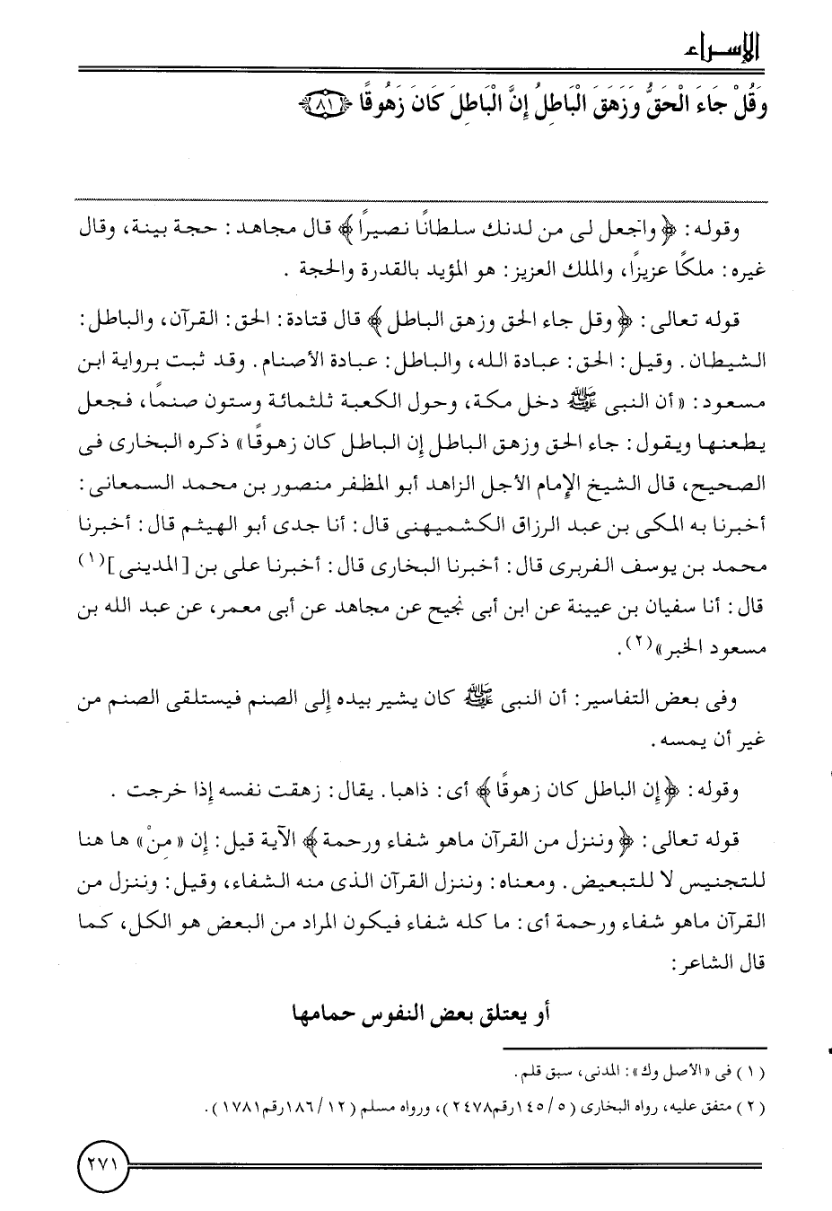 قَوْله تَعَالَى: {وَقل جَاءَ الْحق وزهق الْبَاطِل} قَالَ قَتَادَة: الْحق: الْقُرْآن، وَالْبَاطِل: الشَّيْطَان. وَقيل: الْحق: عبَادَة الله، وَالْبَاطِل: عبَادَة الْأَصْنَام. وَقد ثَبت بِرِوَايَة ابْن مَسْعُود: " أَن النَّبِي دخل مَكَّة، وحول الْكَعْبَة ثلثمِائة وَسِتُّونَ صنما، فَجعل يطعنها وَيَقُول: جَاءَ الْحق وزهق الْبَاطِل إِن الْبَاطِل كَانَ زهوقا " ذكره البُخَارِيّ فِي الصَّحِيح، قَالَ الشَّيْخ الإِمَام الْأَجَل الزَّاهِد أَبُو المظفر مَنْصُور بن مُحَمَّد السَّمْعَانِيّ: أخبرنَا بِهِ الْمَكِّيّ بن عبد الرَّزَّاق الْكشميهني قَالَ: أَنا جدي أبي الْهَيْثَم قَالَ: أخبرنَا مُحَمَّد بن يُوسُف الْفربرِي قَالَ: أخبرنَا البُخَارِيّ قَالَ: أخبرنَا عَليّ بن [الْمَدِينِيّ] قَالَ: أَنا سُفْيَان بن عُيَيْنَة عَن ابْن أبي نجيح عَن مُجَاهِد عَن أبي معمر، عَن عبد الله بن مَسْعُود الْخَبَر ".