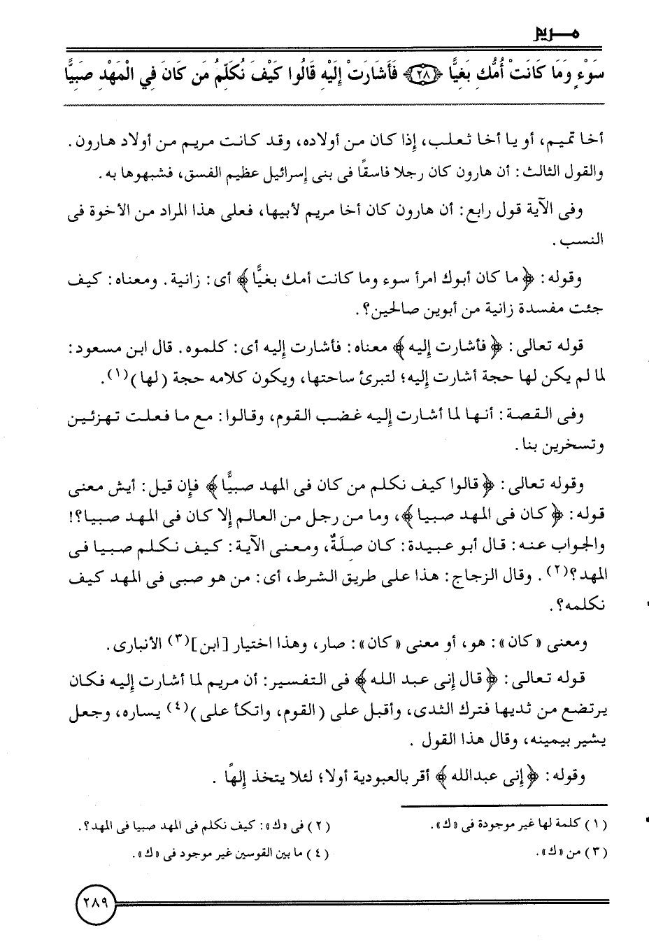 {سوء وَمَا كَانَت أمك بغيا (28) فَأَشَارَتْ إِلَيْهِ قَالُوا كَيفَ نُكَلِّم من كَانَ فِي المهد صَبيا} أَخا تَمِيم، أَو يَا أَخا ثَعْلَب، إِذا كَانَ من أَوْلَاده، وَقد كَانَت مَرْيَم من أَوْلَاد هَارُون. وَالْقَوْل الثَّالِث: أَن هَارُون كَانَ رجلا فَاسِقًا فِي بني إِسْرَائِيل عَظِيم الْفسق، فشبهوها بِهِ.