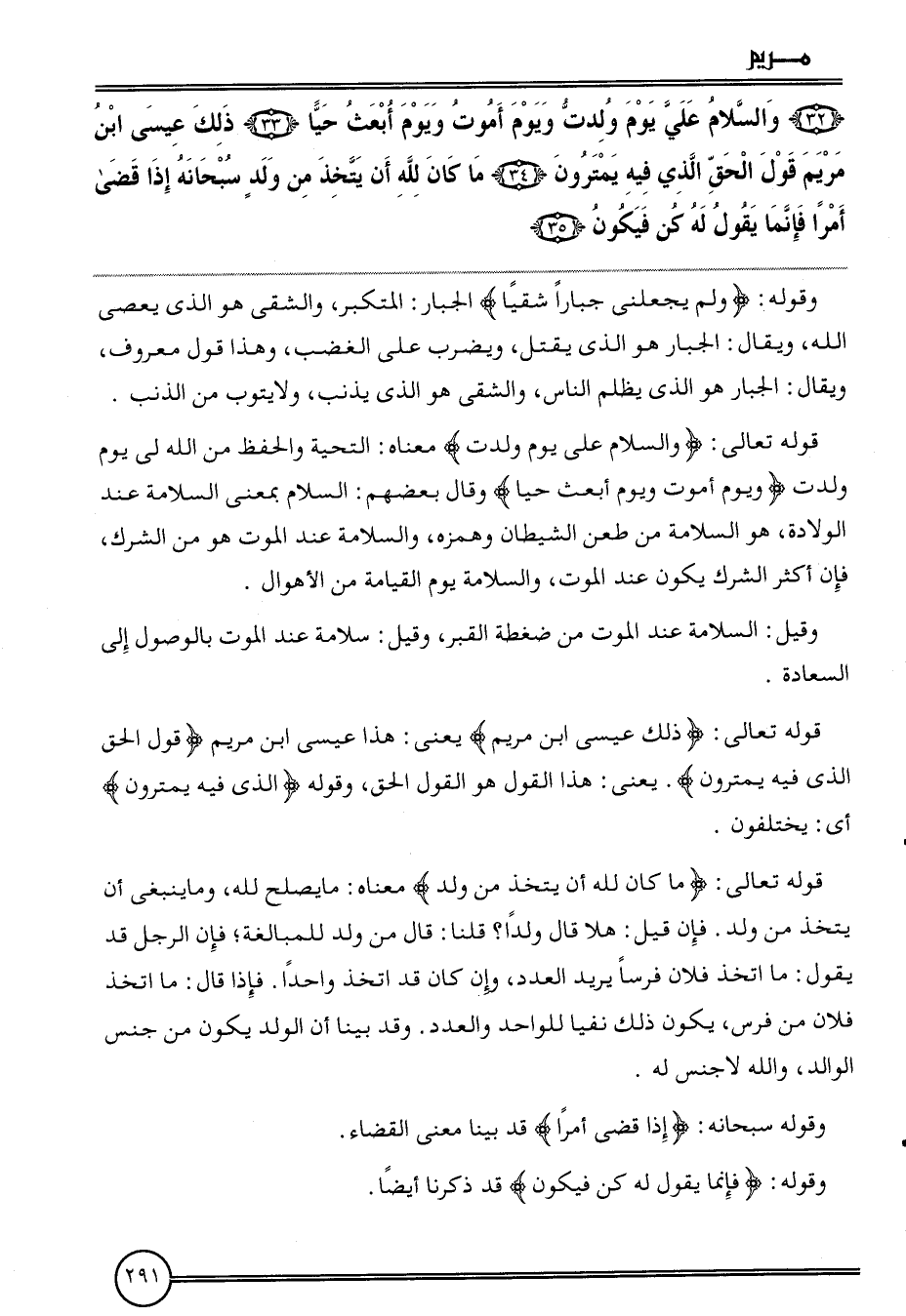 ( {32) وَالسَّلَام عَليّ يَوْم ولدت وَيَوْم أَمُوت وَيَوْم أبْعث حَيا (33) ذَلِك عِيسَى ابْن مَرْيَم قَول الْحق الَّذِي فِيهِ يمترون (34) مَا كَانَ لله أَن يتَّخذ من ولد سُبْحَانَهُ إِذا قضى أمرا فَإِنَّمَا يَقُول لَهُ كن فَيكون (35) }