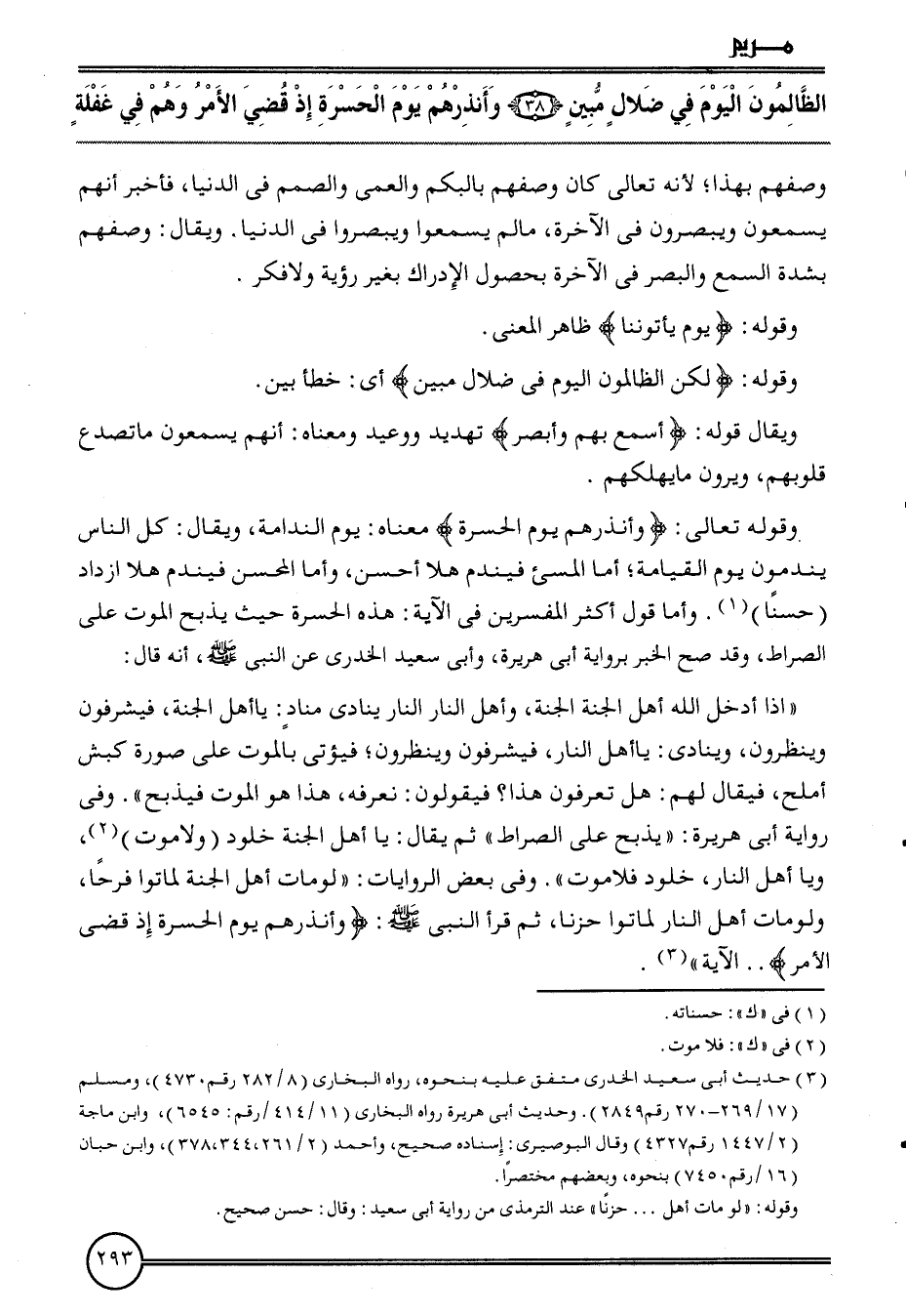 وَقَوله تَعَالَى: {وَأَنْذرهُمْ يَوْم الْحَسْرَة} مَعْنَاهُ: يَوْم الندامة، وَيُقَال: كل النَّاس يندمون يَوْم الْقِيَامَة؛ أما الْمُسِيء فيندم هلا أحسن، وَأما المحسن فيندم هلا ازْدَادَ (حسنا) . وَأما قَول أَكثر الْمُفَسّرين فِي الْآيَة: هَذِه الْحَسْرَة حَيْثُ يذبح الْمَوْت على الصِّرَاط، وَقد صَحَّ الْخَبَر بِرِوَايَة أبي هُرَيْرَة، وَأبي سعيد الْخُدْرِيّ عَن النَّبِي، أَنه قَالَ: