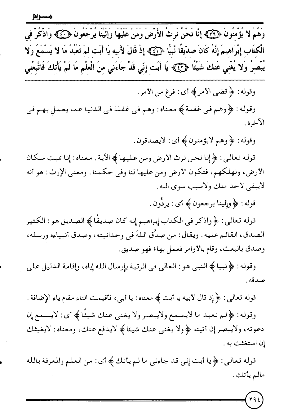 {وهم لَا يُؤمنُونَ (39) إِنَّا نَحن نرث الأَرْض وَمن عَلَيْهَا وإلينا يرجعُونَ (40) وَاذْكُر فِي الْكتاب إِبْرَاهِيم إِنَّه كَانَ صديقا نَبيا (41) إِذْ قَالَ لِأَبِيهِ يَا أَبَت لم تعبد مَا لَا يسمع وَلَا يبصر وَلَا يُغني عَنْك شَيْئا (42) يَا أَبَت إِنِّي قد جَاءَنِي من الْعلم مَا لم يأتك فاتبعني}
