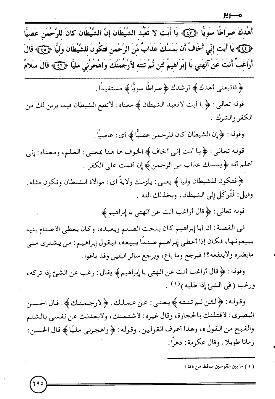 {أهدك صراطا سويا (43) يَا أَبَت لَا تعبد الشَّيْطَان إِن الشَّيْطَان كَانَ للرحمن عصيا (44) يَا أَبَت إِنِّي أَخَاف أَن يمسك عَذَاب من الرَّحْمَن فَتكون للشَّيْطَان وليا (45) قَالَ أراغب أَنْت عَن آلهتي يَا إِبْرَاهِيم لَئِن لم تَنْتَهِ لأرجمنك واهجرني مَلِيًّا (46) قَالَ سَلام}