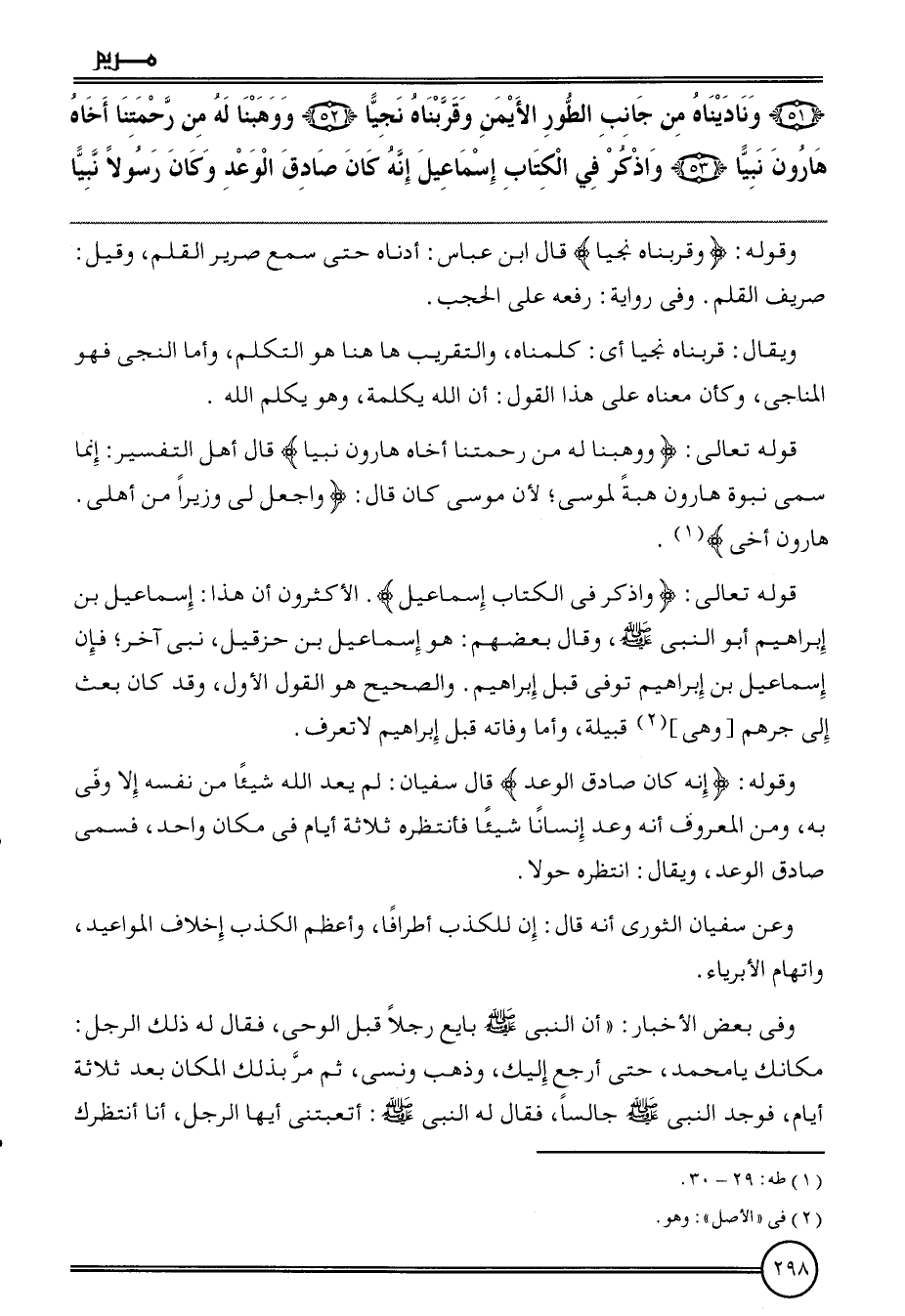 ( {51) وناديناه من جَانب الطّور الْأَيْمن وقربناه نجيا (52) وَوَهَبْنَا لَهُ من رَحْمَتنَا أَخَاهُ هَارُون نَبيا (53) وَاذْكُر فِي الْكتاب إِسْمَاعِيل إِنَّه كَانَ صَادِق الْوَعْد وَكَانَ رَسُولا نَبيا}