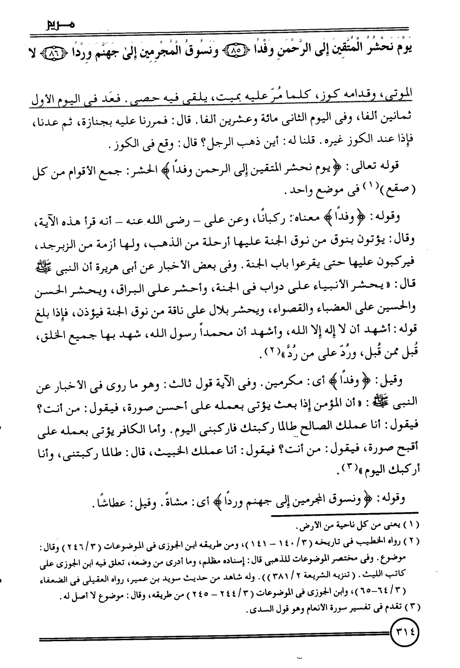 وَقَوله: {وَفْدًا} مَعْنَاهُ: ركبانا، وَعَن عَليّ - رَضِي الله عَنهُ - أَنه قَرَأَ هَذِه الْآيَة، وَقَالَ: يُؤْتونَ بِنُوق من نُوق الْجنَّة عَلَيْهَا أرحلة من الذَّهَب، وَلها أزمة من الزبرجد، فيركبون عَلَيْهَا حَتَّى يقرعُوا بَاب الْجنَّة. وَفِي بعض الْأَخْبَار عَن أبي هُرَيْرَة أَن النَّبِي قَالَ: " يحْشر الْأَنْبِيَاء على دَوَاب فِي الْجنَّة، وأحشر على الْبراق، ويحشر الْحسن وَالْحُسَيْن على العضباء والقصواء، ويحشر بِلَال على نَاقَة من نُوق الْجنَّة فَيُؤذن، فَإِذا بلغ قَوْله: أشهد أَن لَا إِلَه إِلَّا الله، وَأشْهد أَن مُحَمَّدًا رَسُول الله، شهد بهَا جَمِيع الْخلق، قبل مِمَّن قبل، ورد على من رد ".